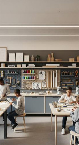 make this minimal makers space as an active environment for students that are creating and building models add subdued sophisticated colors art supplies on the peg board