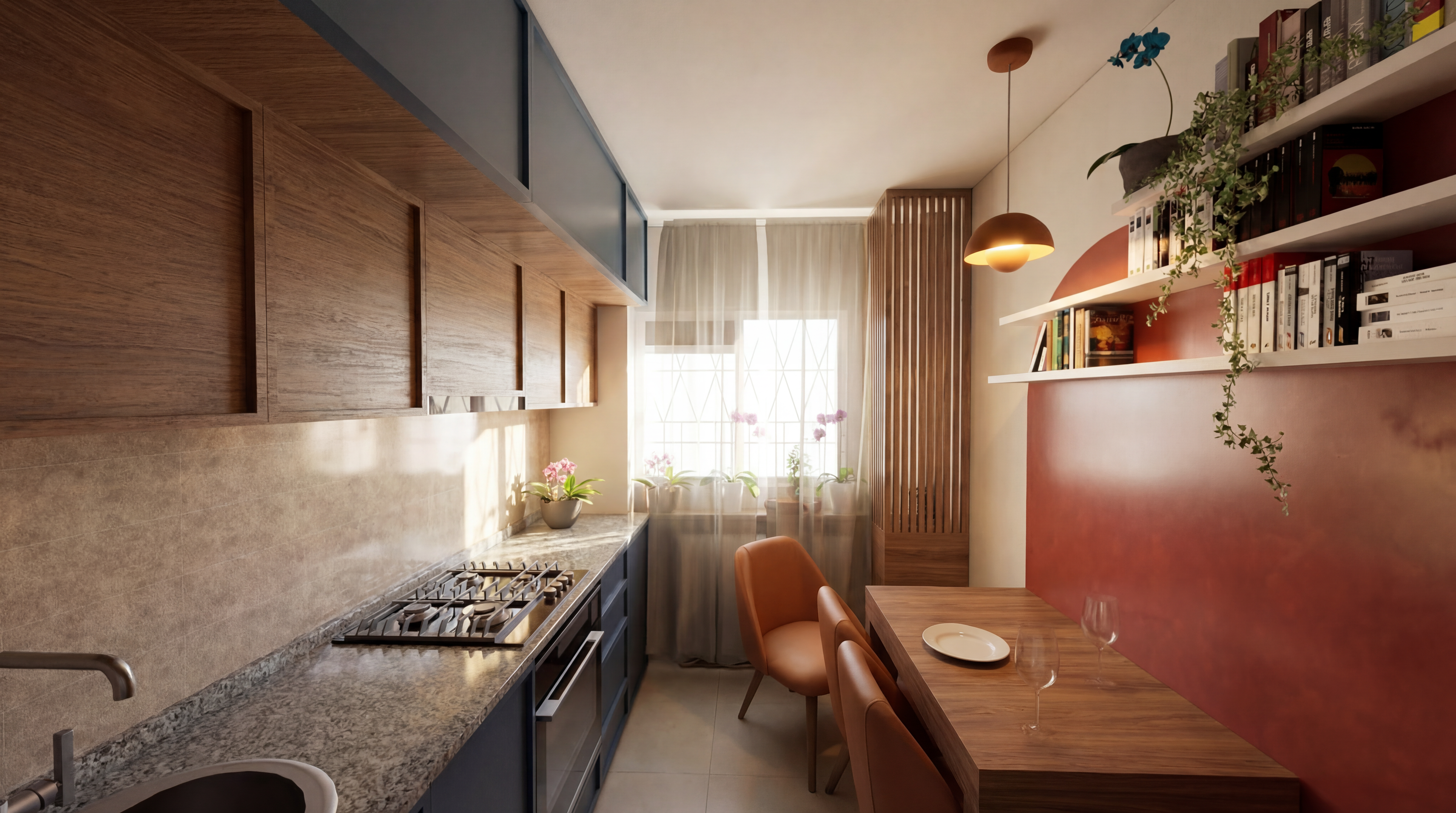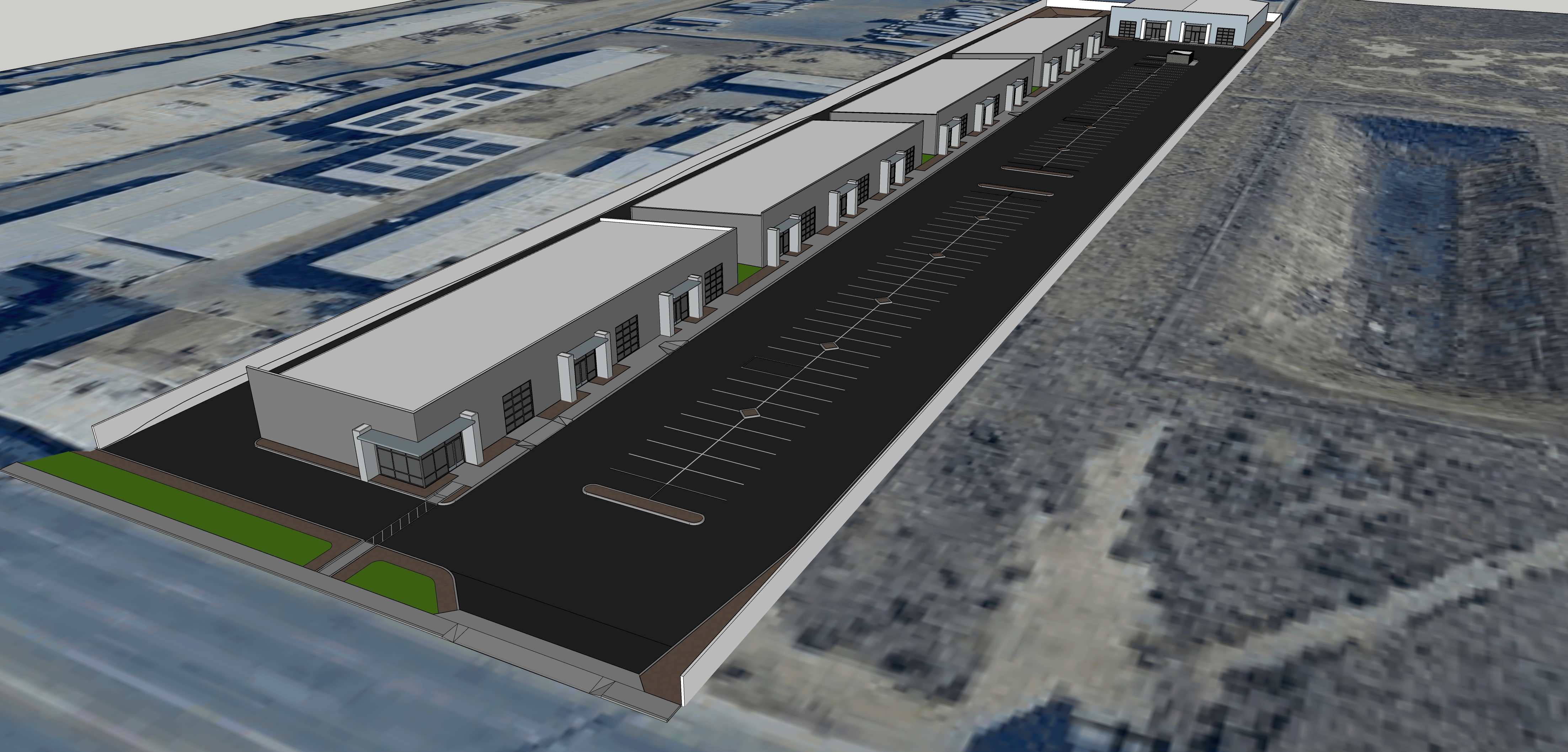 aerial view of new site containing 3 metal buildings with corrugated metal exterior modern storefront windows and doors rollup doors and anodized aluminum overhangs place a few cars in the parking lot and add trees in planters