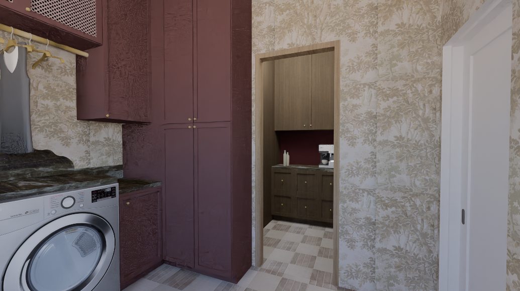 interior shot of laundry room and view into pantry maintain colors and materials trim around doorway into pantry is a white oak no led lights under the cabinets the walls in the pantry are a maroon wine colored grass cloth wallpaper