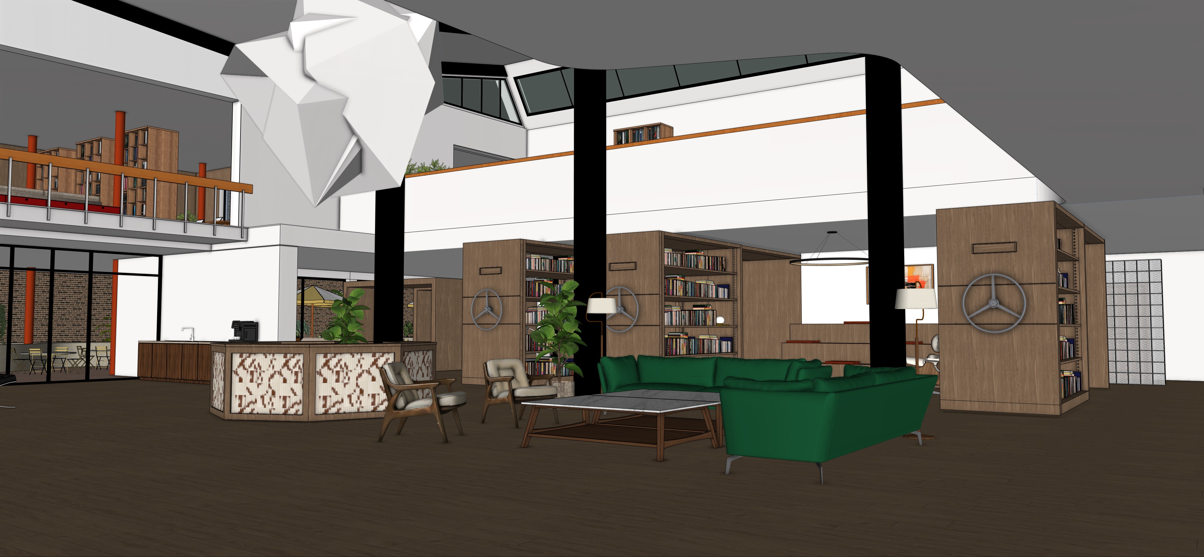 preserve the original sketchup architecture exactly as modeled do not modify geometry layout proportions furniture placement walls ceilings or built in elements convert the scene to natural daytime lighting soft diffused daylight entering from openings and upper windows balanced neutral exposure no dramatic shadows no cinematic night effect lighting should be primarily natural daylight 4000k 5000k creating a calm and creative atmosphere bookshelves should not emit strong glow or accent lighting avoid warm led strip effects maintain the warm material character natural wood tones matte textures soft realistic shadows the atmosphere should feel creative and refined but clearly daytime add a few people naturally inhabiting the space one reading one working on a laptop someone casually seated natural posture neutral clothing not posed photorealistic architectural visualization natural daylight interior editorial architecture photography style calm creative workspace enhance the scene with a warm intimate creative lounge atmosphere inspired by editorial architectural photography soft indirect warm lighting 2700k 3000k subtle shadows cozy and refined ambiance improve material realism while respecting original materials warm wood tones natural textures matte finishes soft light gradients add people naturally inhabiting the space some sitting on sofas one person reading one working quietly on a laptop others casually conversing natural posture relaxed body language neutral contemporary clothing no posing people must integrate realistically with scale perspective and lighting do not overcrowd the space photorealistic architectural visualization calm nocturnal creative atmosphere dezeen and archdaily style cinematic but subtle