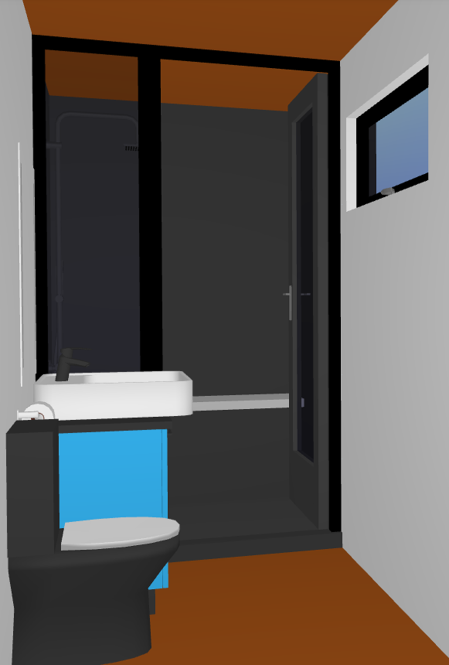 this is the first floor bathroom of a small modern home the shower should have floor to ceiling large black tiles as well as a solid marble bench along the back wall the ceiling and floor should be in a walnut plank with the walnut planks going front to back add golden hour lighting