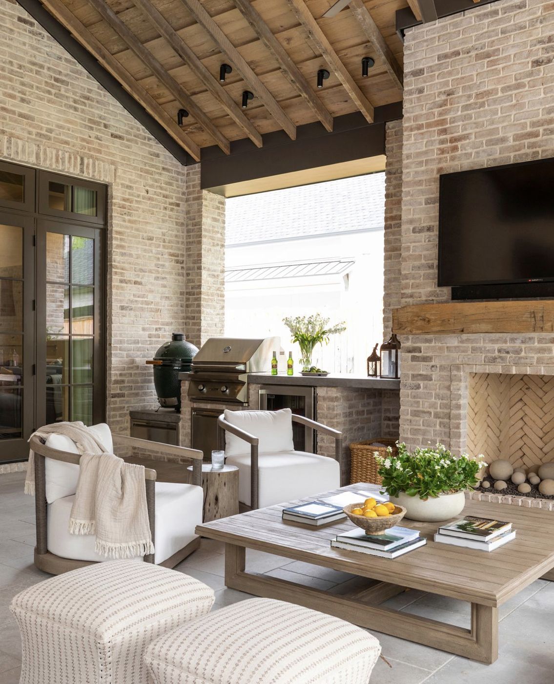 draw an outdoor kitchen with a table to seat 18 and grill and green egg make view straight on