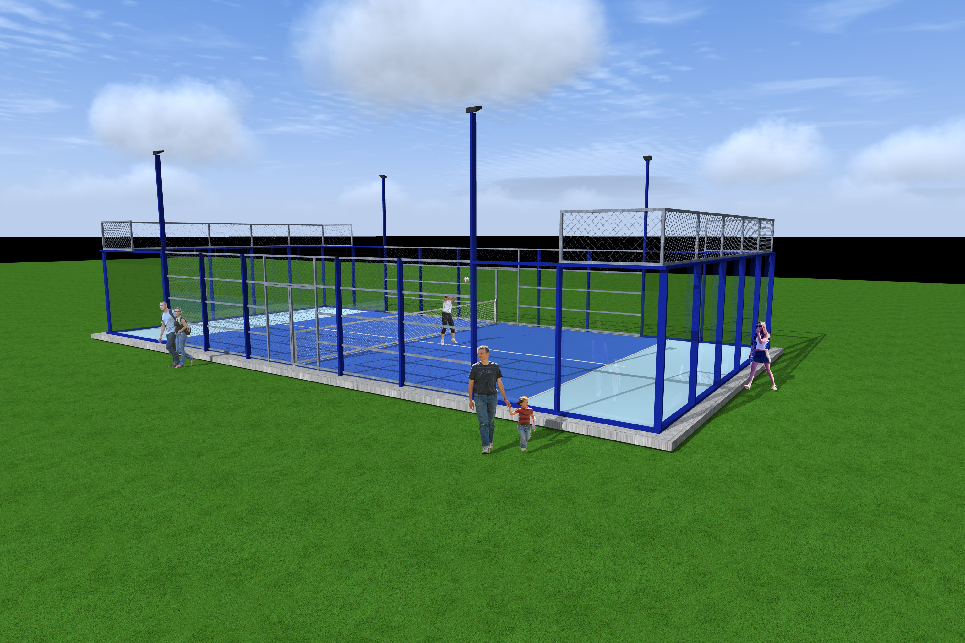 exterior shot poti pune un trotuar din pavele autoblocante in jurul terenului de 2m latime si inca 2 jucatori in tren architecture