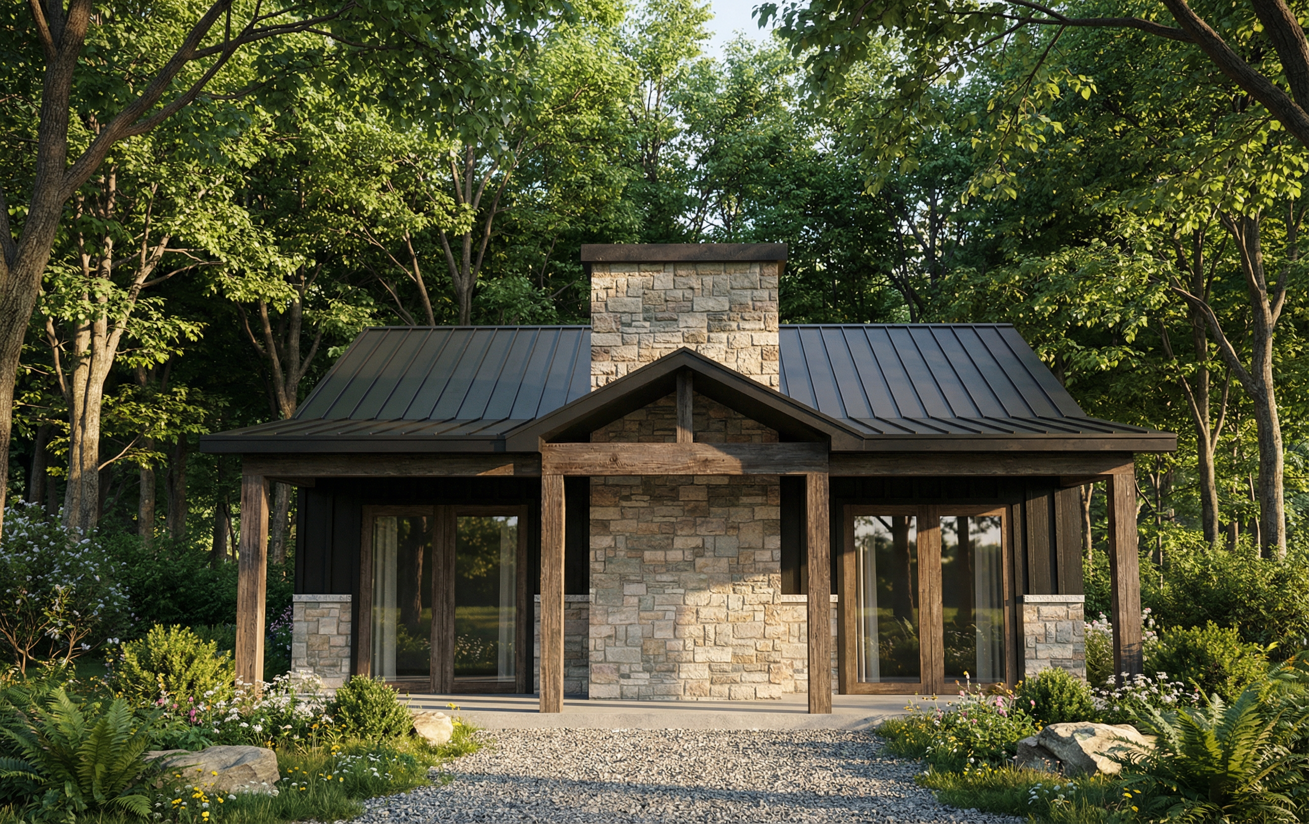 photorealistic exterior architectural rendering of the uploaded elevation keep the exact same massing roof shape window door sizes and locations do not add or remove openings style high end modern french transitional materials light limestone light cream stone cladding smooth light stucco accents white trim and cornices black aluminum windows with grid mullions dark charcoal shingle roof symmetrical facade clean detailed trim realistic glass reflections landscaping manicured boxwood hedges simple foundation planting neat lawn lighting golden hour soft daylight or dusk with warm interior lights camera straight on elevation 35 50mm lens look vertical lines perfectly straight ultra realistic sharp 4k
