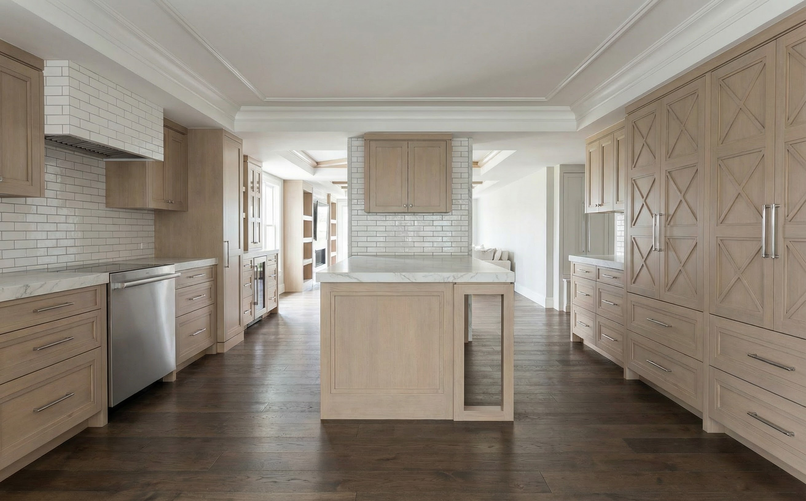 this kitchen will have sherwinn williams dove white color cabinets with slim shaker doors and brass bar pull handles and brass kitchen faucet flooring will be light oak appliances will be stainless steel all walls will be flat white color all doors will be a flat white color countertop will be caesarstone 7524 golden sky and backsplash will be white