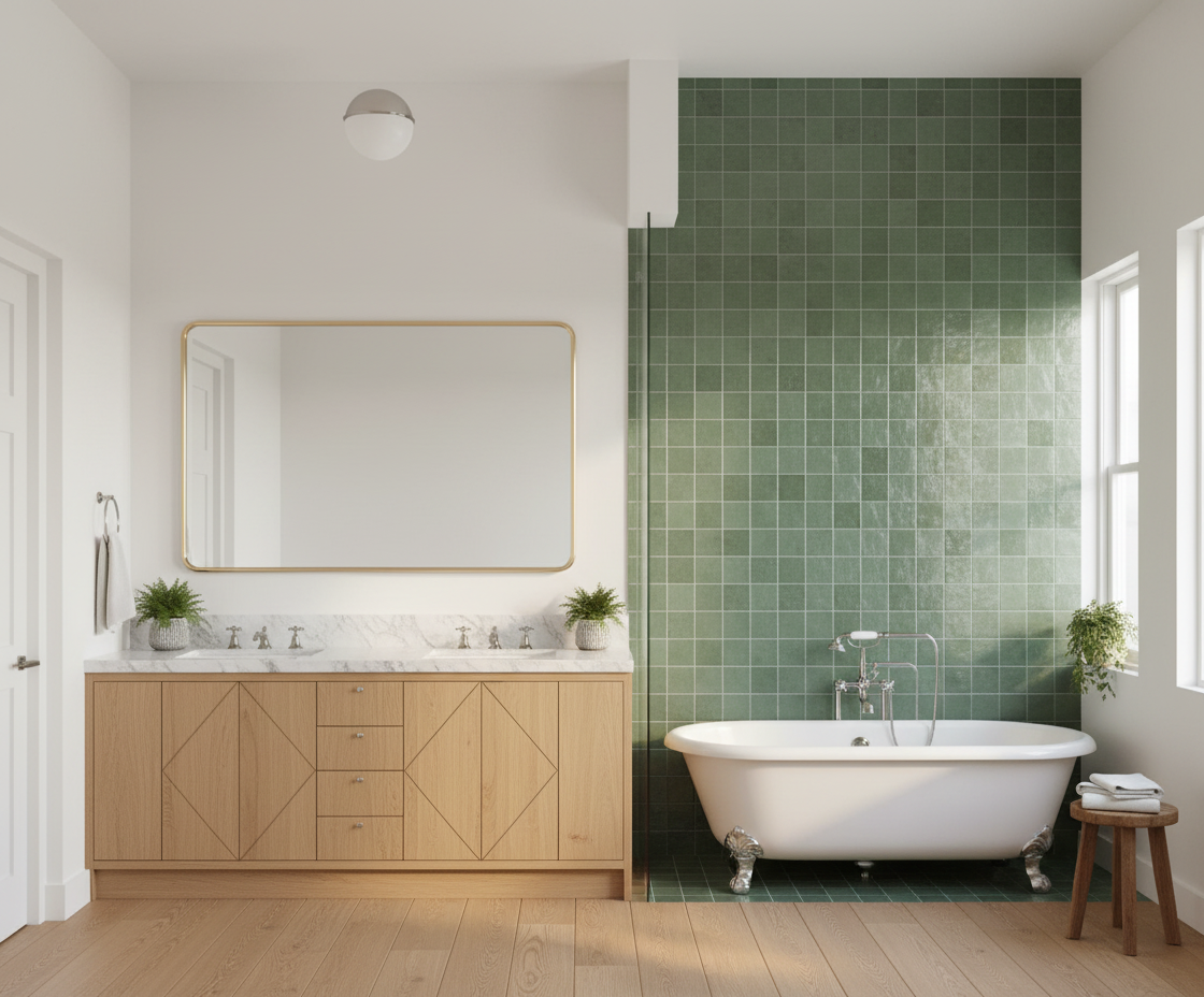make it moody change floor on right to zellige tile floor on left to beige tile wood trim sliding door get rid of plants add wall sconce on top of the mirror