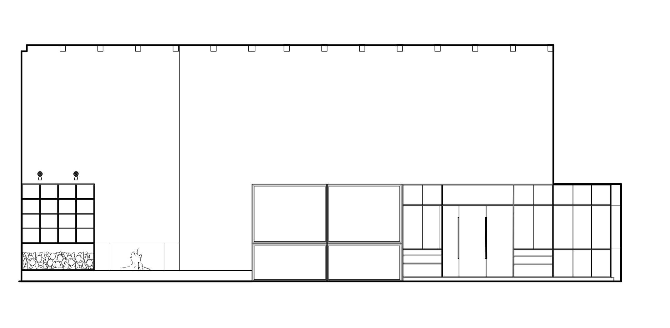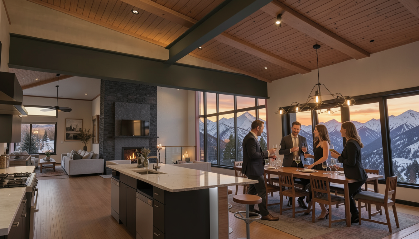 modern serene living room and kitchen with a shed roof applied natural stained white oak beams applied natural stain fir ceiling planks and a white oak cabinets bookcase firewood holder kitchen cabinets with integrated drawer pulls as shown and a stainless steel countertop as shown the floor is natural stain fir planks walls are a cream plaster fireplace hearth is a natural stone light fixture as shown in burnished nickel