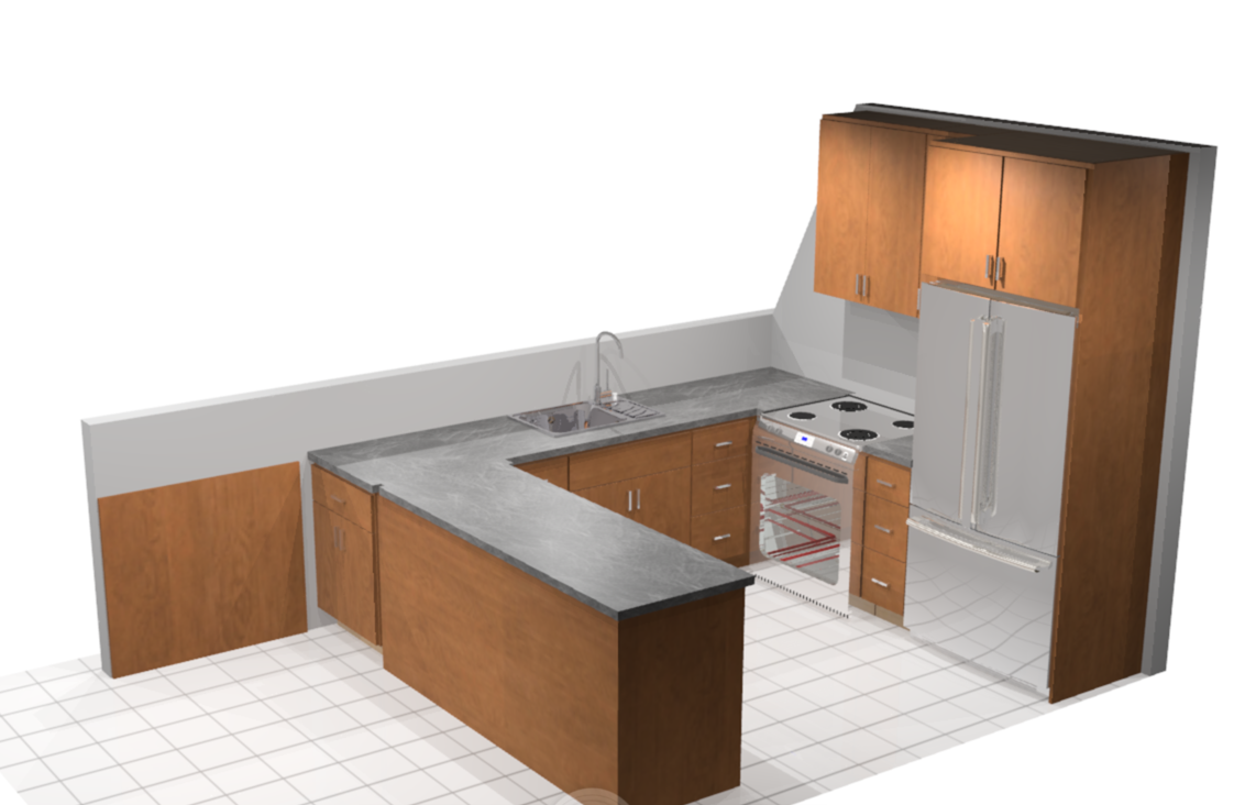this is a kitchen for a wooden a frame cabin with wood log walls on the sink wall and dry wall walls on the frig wall please show the cabinets in a forest green color and white grey stone countertops and 12 of the countertop material for backsplash on sink wall the walls start at 40 tall against that back wall keep the skylight window but remove the wall window and reduce those walls to 40 tall at the start of the slope please add a big checkerboard floor in cream and burnt red tile floor have the frig wall be white drywall
