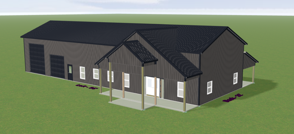 can you make this look more realistic as if taken from a camera please add a driveway to the garage doors make the lawn look nice and add some rural trees in the background the small porch on the front will get a decorative wood truss the porch posts will be a nice looking wood