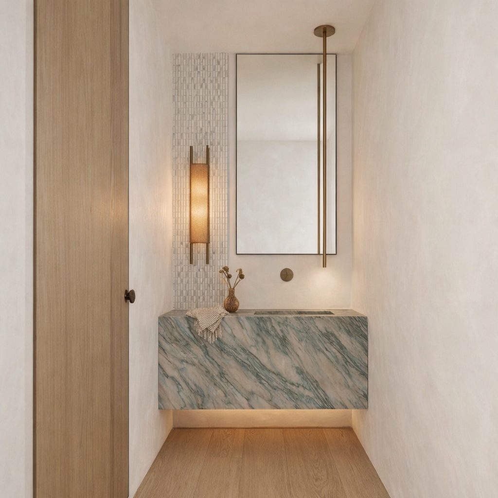 overall aesthetic warm contemporary minimalism restrained tonal and material led no ornament everything is texture and proportion cabinetry flat front handle less doors throughout upper and lower warm taupe greige tone not grey not brown somewhere between with a subtle wood grain visible base cabinetry door frame disappears into the millwork stone countertop dramatic bookmatched or large format slab grey cream marble with heavy movement possibly fantastico arni verde alpi or similar italian marble island has a waterfall edge with thick profile same stone used for backsplash on the stove wall sink side does not have stone backsplash flooring wide plank herringbone hardwood warm honey light oak tone matte finish medium width planks fixtures square angular matte bronze or gunmetal faucet minimal spout 90 geometry lighting sculptural pendant branching arm in dark bronze black with opal globe shades in varying sizes artistic not symmetrical subtle under cabinet or recessed puck lighting on perimeter wall warm glow on backsplash color palette for rendering cabinetry warm greige ncs s 5010 y50r or benjamin moore rockport gray range stone grey green marble with cream and charcoal veining floor warm light oak metal dark bronze antique brass matte furniture add modern sleek stools