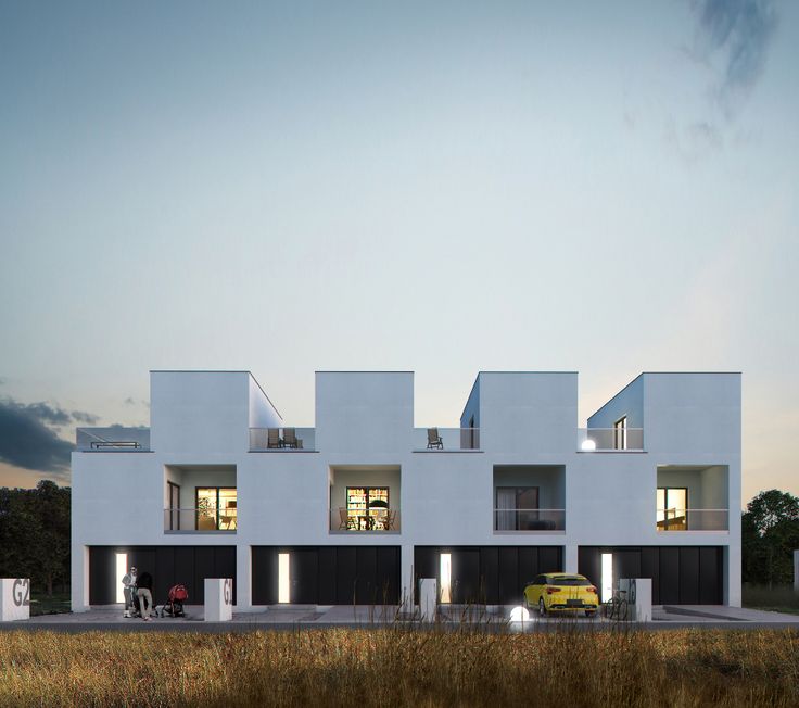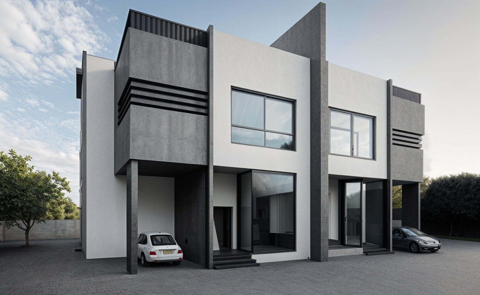 exterior shot a modern two story house with a minimalist design painted in a soft white color the roof is a sleek dark gray contrasting elegantly with the building the windows have a glossy black trim adding depth and sophistication surround the house with a lush green lawn dotted with colorful flowers in shades of pink yellow and lavender the sky is a bright blue with a few fluffy white clouds creating a calm and peaceful atmosphere light reflects delicately off the windows capturing the serene afternoon light