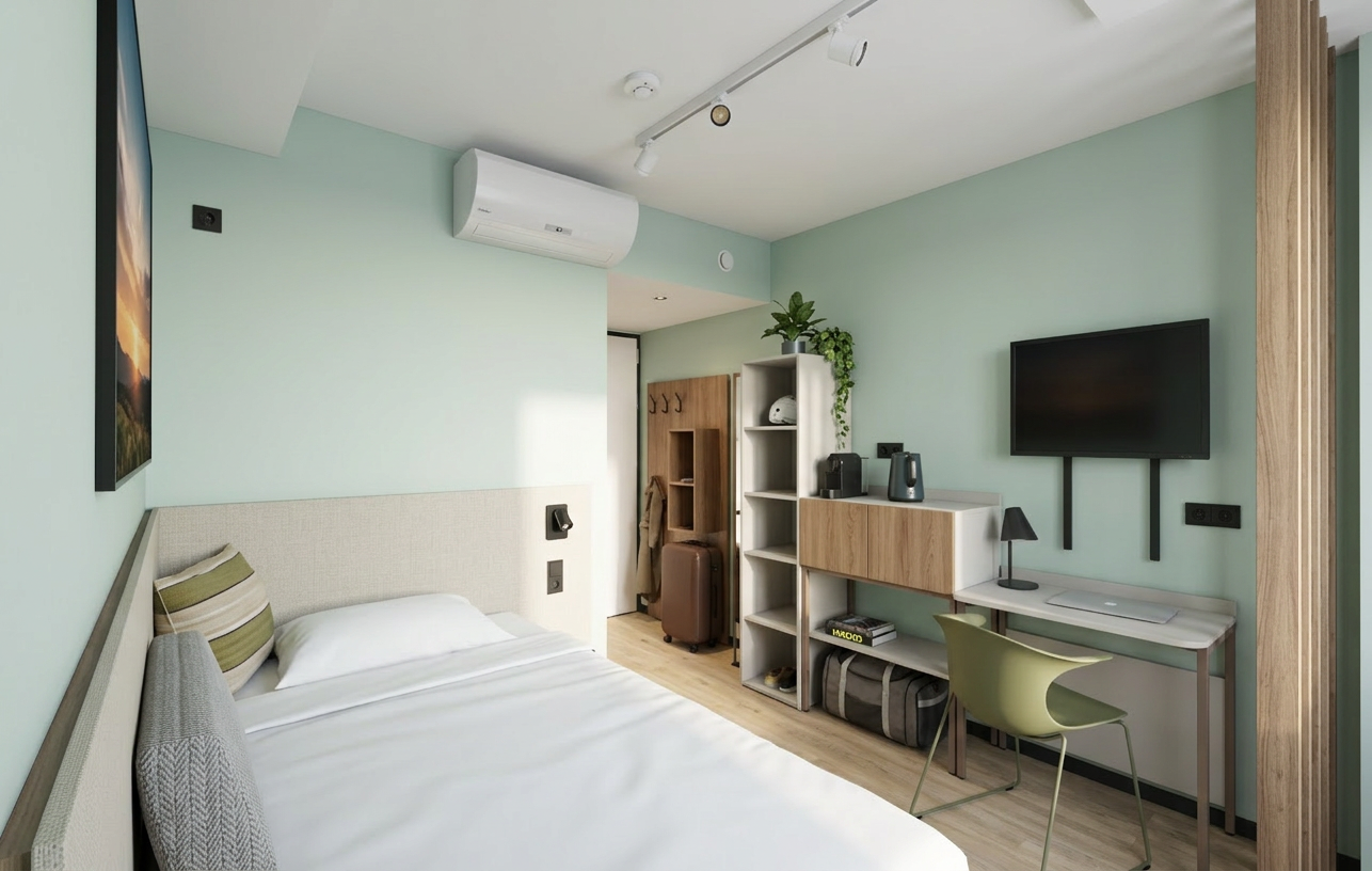 render a modern kitchen interior with a cozy atmosphere the cabinets feature warm wood textures light beige upper cupboards and a stainless steel refrigerator the backsplash and countertops are a soft cream marble adding elegance the dining table is dark wood complemented by beige cushioned chairs the floor is a light gray marble reflecting natural light softly accentuate the scene with soft ambient lighting to create a warm inviting environment include vibrant green apples on the counter and a red pot on the stove for a pop of color the overall mood is sleek yet welcoming perfect for family gatherings also add some warm lights