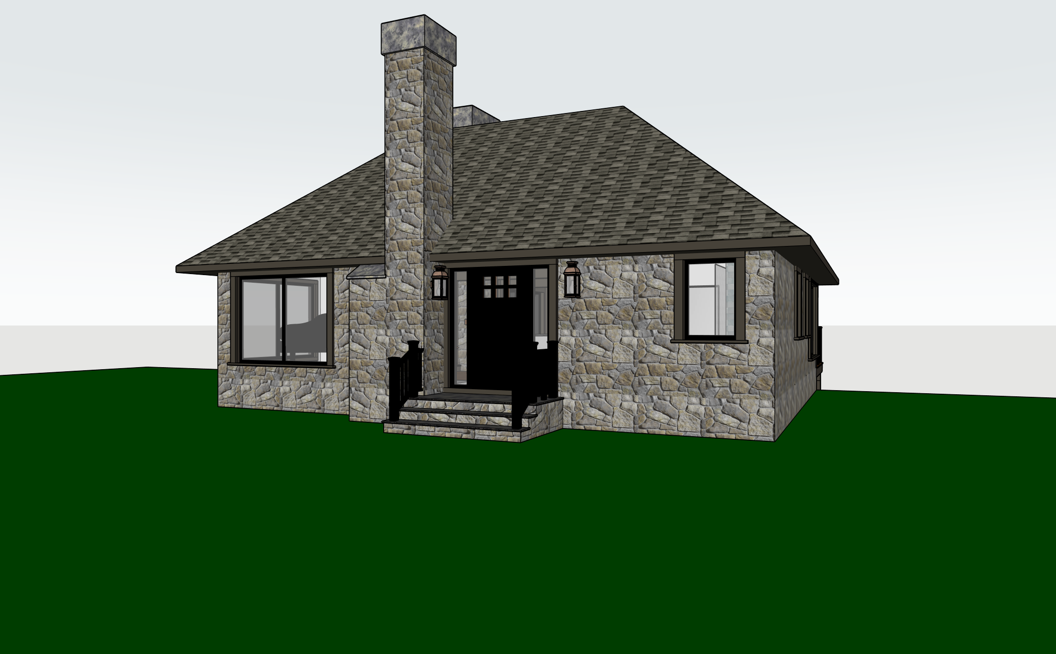 keeping the materials of the house with small flower beds in front of the house a curved driveway parallel to the front of the house with a walkway from the driveway to the front steps front and a lush forest behind the house architecture