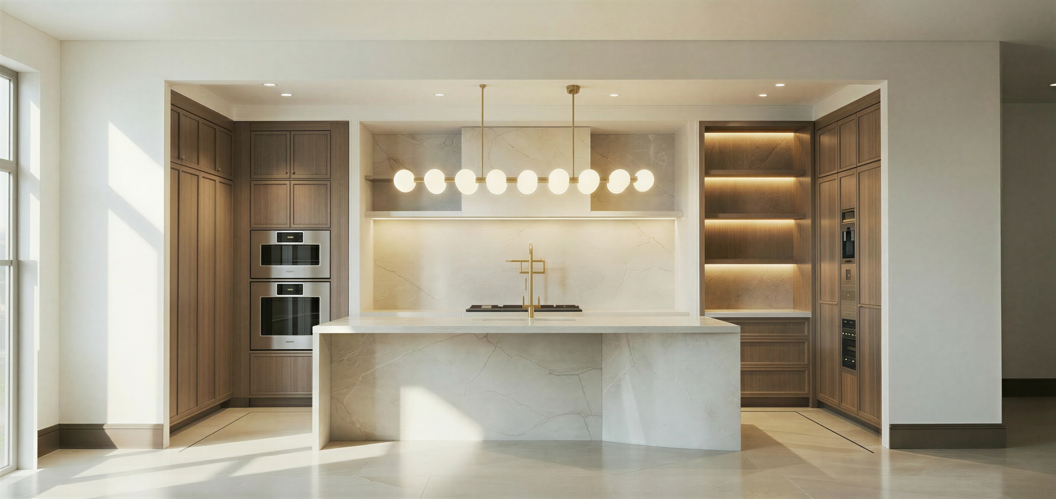 convert this kitchen rendering into a highly realistic editorial style luxury real estate photograph maintain the exact architecture layout cabinetry configuration appliance locations plumbing fixture locations lighting placement proportions and all existing design elements exactly as modeled do not redesign restyle move add or remove anything this image will serve as a base for multiple color variations so consistency is critical enhance realism only through lighting material accuracy texture shadow depth and reflections overall style modern transitional luxury condo kitchen clean refined warm and highly realistic similar to architectural digest editorial photography cabinetry rift sawn wood cabinetry with a natural stain two step slim shaker door profile grain should be tight linear and consistent with rift cut wood finish should feel matte and natural not glossy subtle shadow lines at all panel edges to emphasize depth and craftsmanship countertops taj mahal quartzite with a honed finish soft creamy base with subtle movement and natural variation no high gloss surface should appear soft and lightly matte maintain realistic edge thickness and clean fabrication appliances do not modify positions all appliances remain exactly as shown gaggenau appliances should appear highly realistic with accurate material finishes expressive series oven and microwave are stacked maintain exact placement right side includes a gaggenau climate cabinet do not move enhance realism only use subtle reflections and correct stainless or graphite tones island maintain the exact curved overhang detail emphasize smooth geometry and clean radius add realistic shadowing beneath the overhang for depth plumbing fixtures do not modify location sink faucet kallista juxtapose semi professional faucet in brushed french gold pot filler kallista juxtapose pot filler in brushed gold finishes should read as warm metallic with soft reflectivity not mirror like maintain exact placement as shown enhance realism only shelving lighting shelves on the right include a soft integrated under shelf led glow lighting should be warm and subtle not overpowering light should gently wash the wall and objects with realistic falloff flooring msi mccarran flooring in whitlock color herringbone pattern in main field border condition in standard plank orientation maintain exactly as shown include brass transition strip between herringbone and border wood should show natural grain slight variation and a low sheen finish walls ceiling sherwin williams origami white soft clean warm white tone smooth finish with realistic light bounce lighting atmosphere natural daylight entering the space with balanced exposure no harsh or blown out highlights soft shadows for depth and realism interior lighting should complement daylight not compete rendering style photorealistic editorial high end real estate photography accurate scale lens perspective and proportions no distortion or artificial sharpening materials must read true to life with correct reflectivity and texture important do not change layout geometry materials placement appliance locations fixture locations or design intent in any way only enhance realism