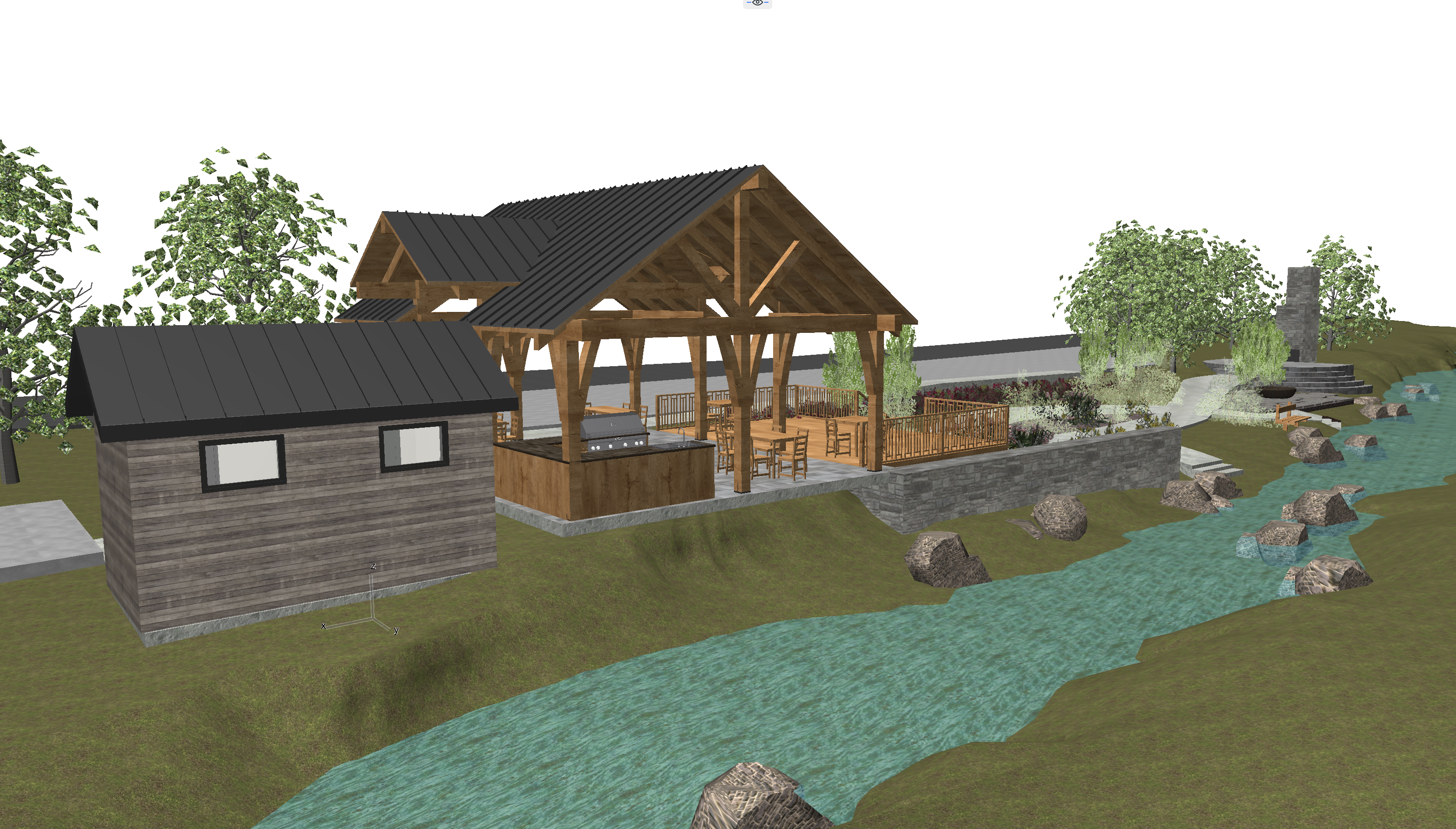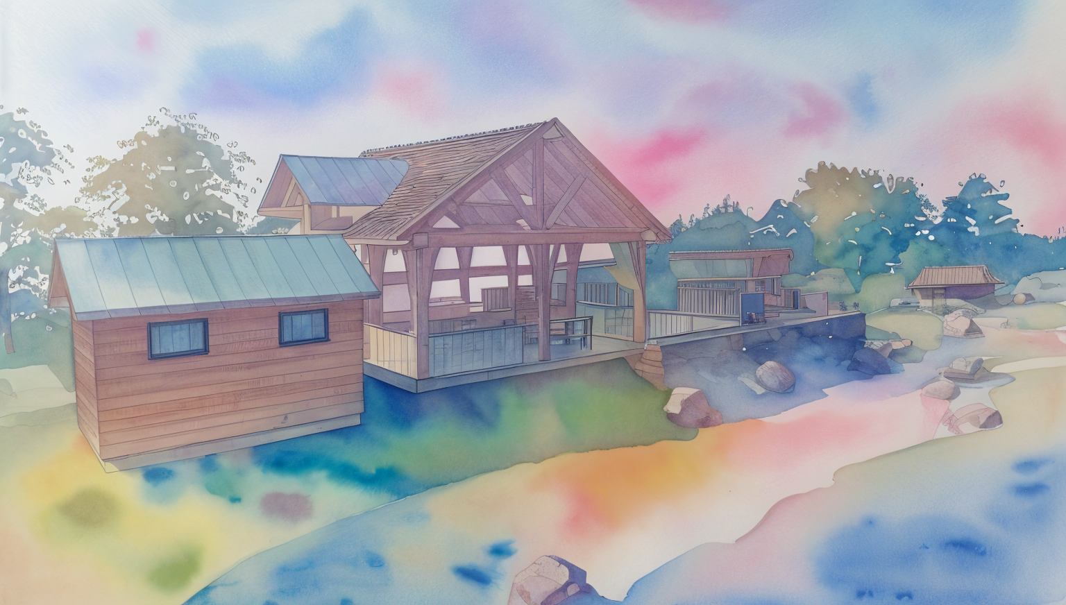 perspective shot twilight watercolor render with woods in the background architecture