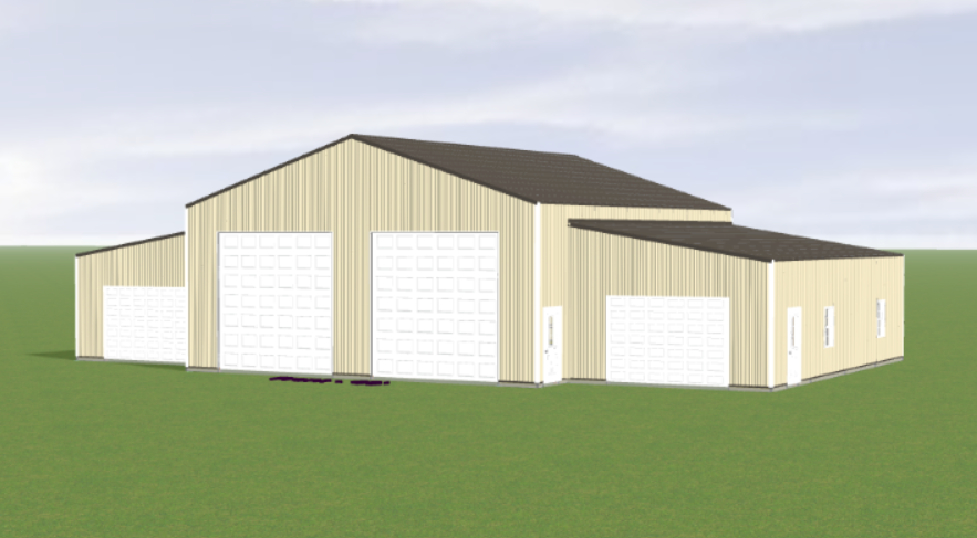 show this building in a yard setting with a field behind it and all gravel parking lot in front of it roof is a burnished slate steel ag panel profile walls are a steel ag panel profile in a light stone color all doors and windows are white and the corners on the building are white all trims around windows and doors are white