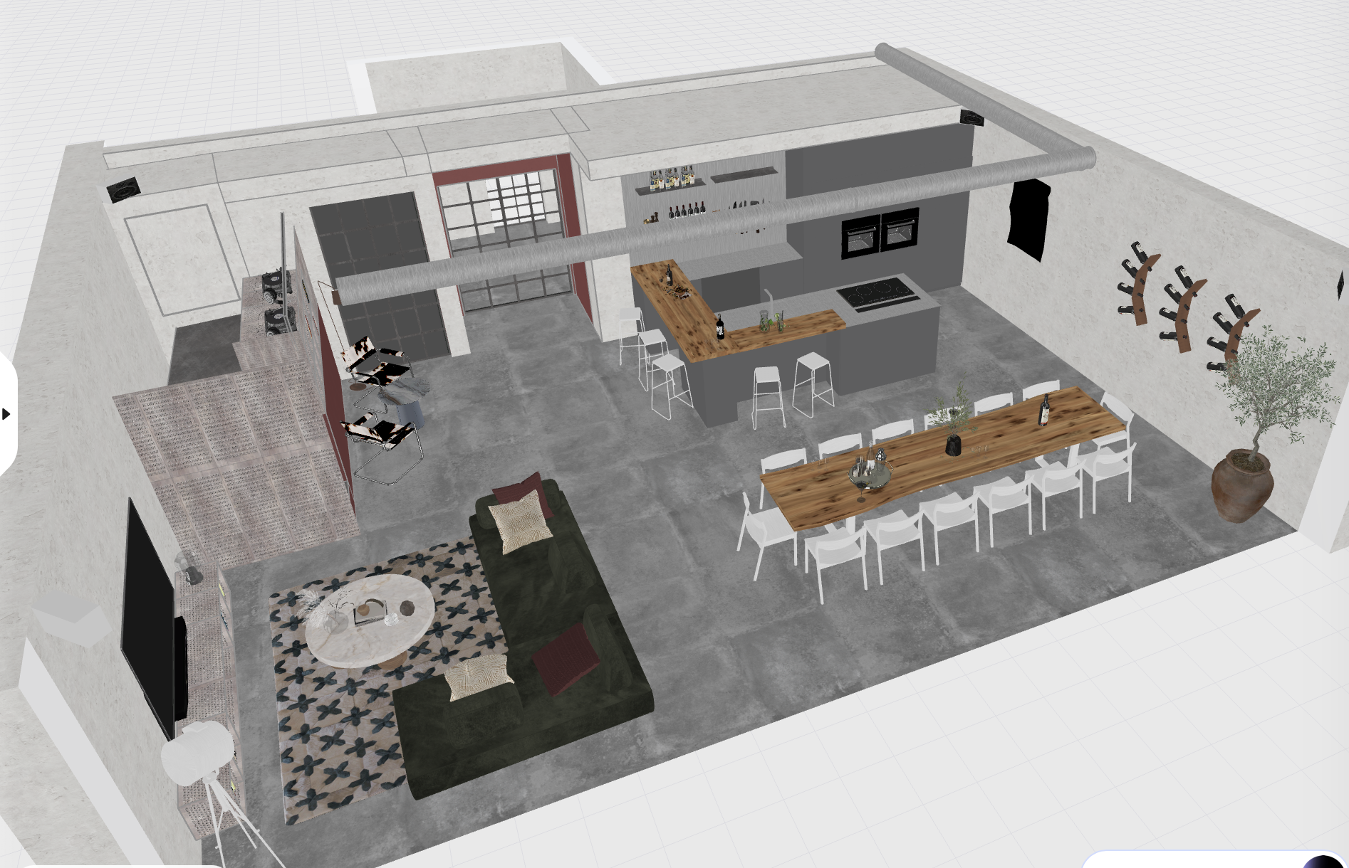 render a modern open concept living and dining space with an industrial aesthetic the floor is a sleek medium gray concrete with a smooth finish the walls are textured off white adding warmth in the kitchen use a deep charcoal gray for the cabinetry with an oak wood countertop complemented by white bar stools the dining table is a rich walnut surrounded by white chairs accented with a dark ceramic vase and small green plants a plush dark green sectional sofa is adorned with earthy toned pillows facing a low light wood coffee table on a patterned beige and navy rug add contemporary art on the walls and a large leafy plant in a terracotta pot for a touch of nature the atmosphere is cozy and sophisticated with soft ambient lighting enhancing the textures and tones