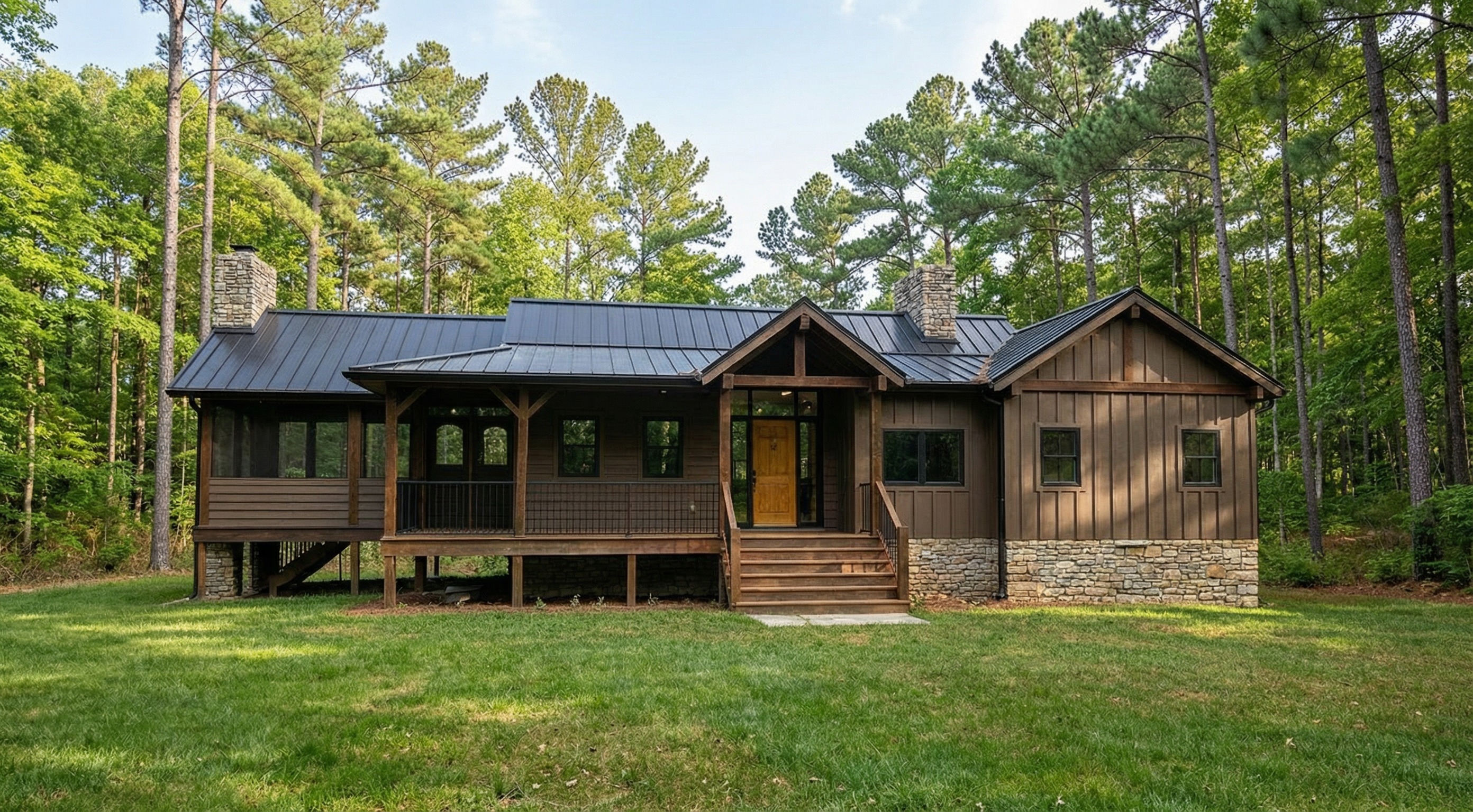 add exterior lights and black white dog sitting on porch landscape with grasses around the front gravel sidewalk to entry only single wood screen door on left