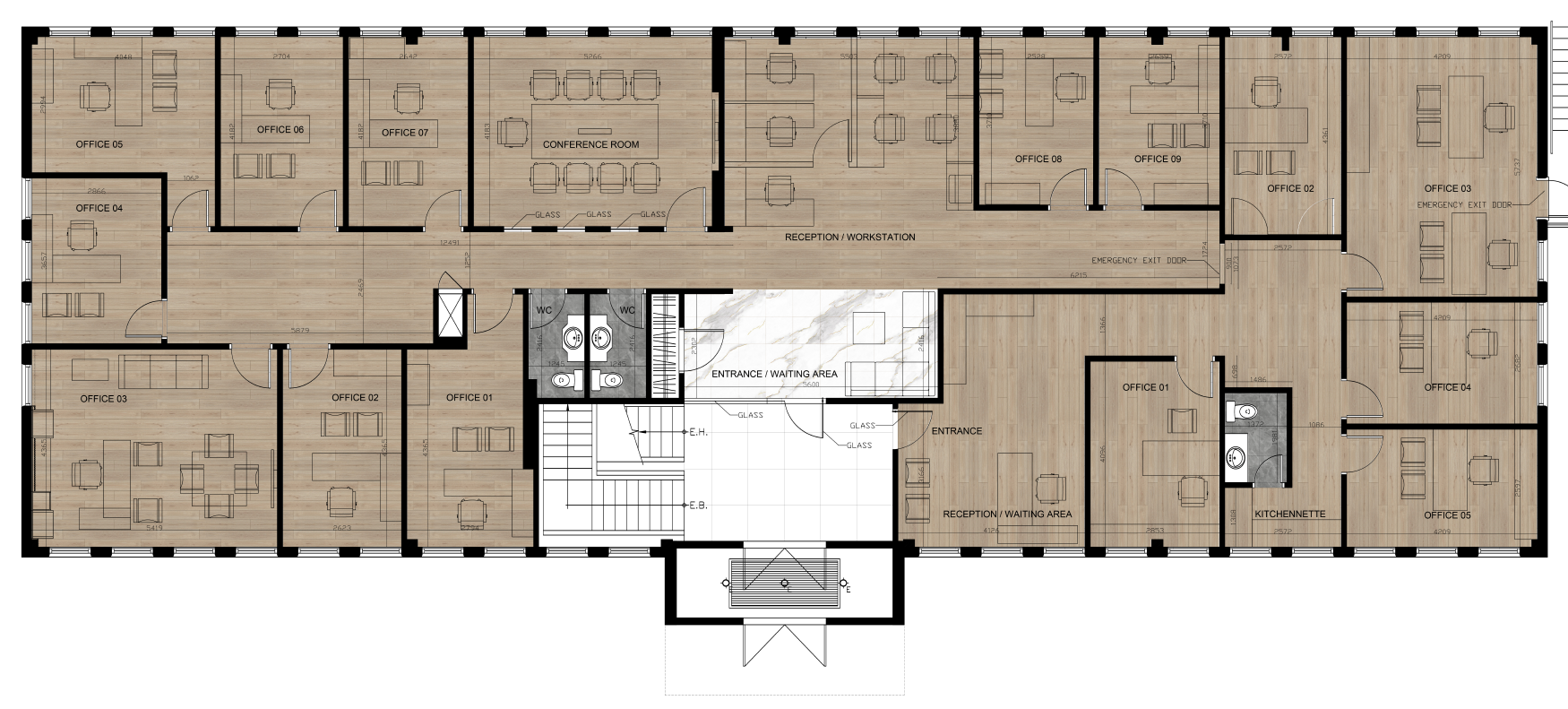 convert this floor plan into a realistic isometric 3d view of a office show the space from an elevated angle with furniture walls and details visible kepp all the desks same size l shapes and the legs of desks should be white and the desk almost same color as floor even a bit lighter color use the same furniture as shows on the plan do not change the orientation of the floorplan