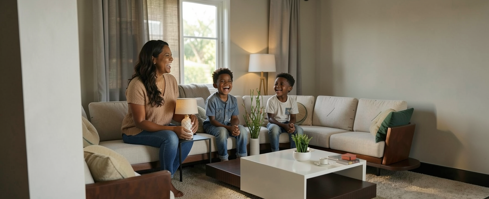 black mom and 2 black boys laughing and while eating popcorn