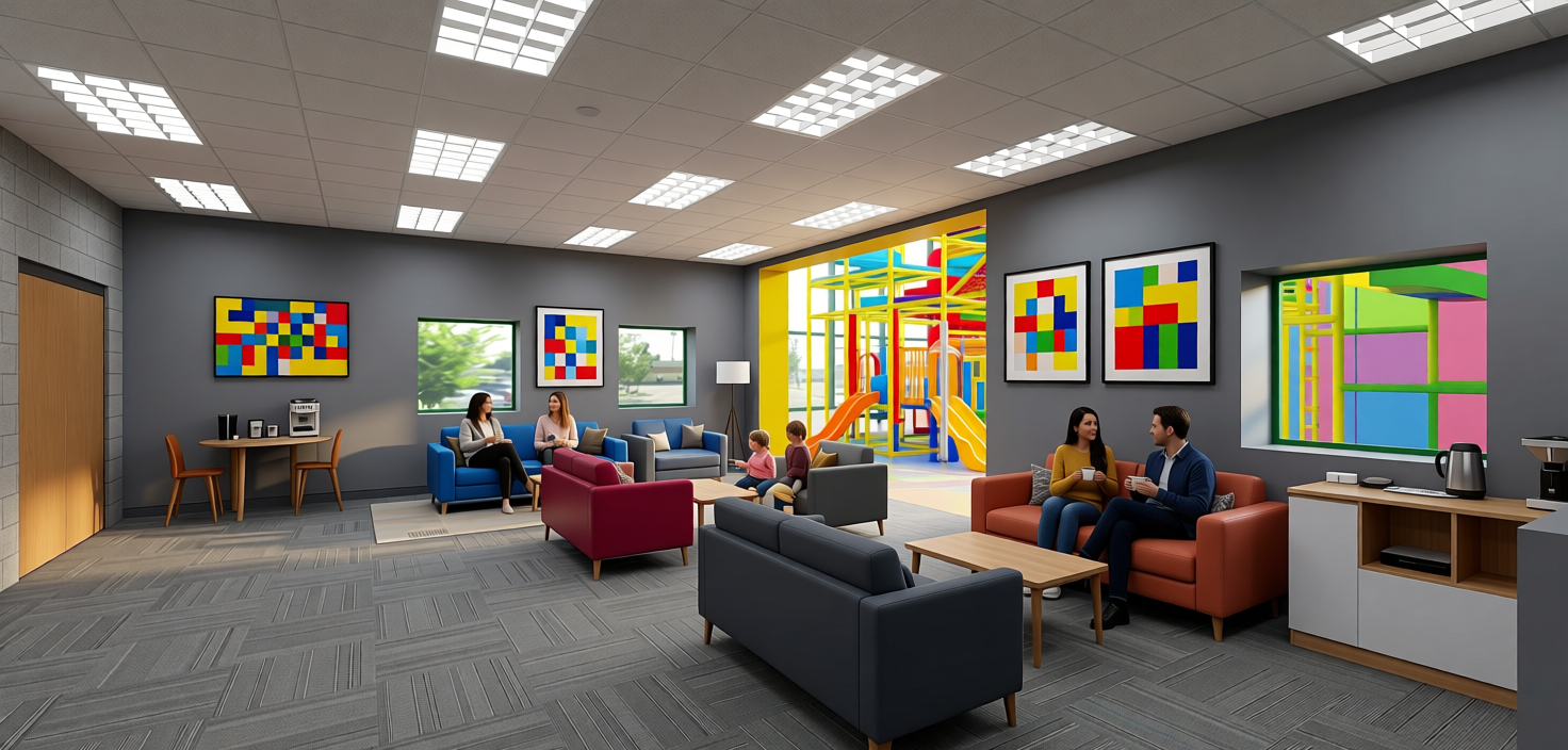 add lounge with small coffee station left of windows and parents sitting in furniture drinking coffee looking through opening in wall to indoor playground add 2 kids and more lounge furniture add 3 total pictures on walls walls in lounge to be gray modern furniture floor is carpet tile