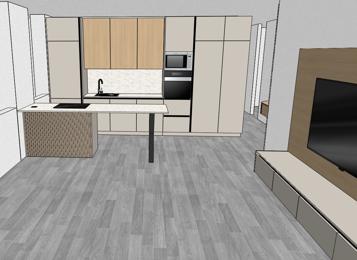 modernist interior shot create a modern apartment interior with a minimalist aesthetic use light oak wood for the kitchen cabinets and tv panel the floor should be a medium gray wood texture the walls are a soft white for a bright atmosphere kitchen countertop and backsplash in white marble with subtle gray veining furnish the space with sleek matte black appliances and fixtures ensure natural light fills the room highlighting a harmonious and cozy ambiance architecture