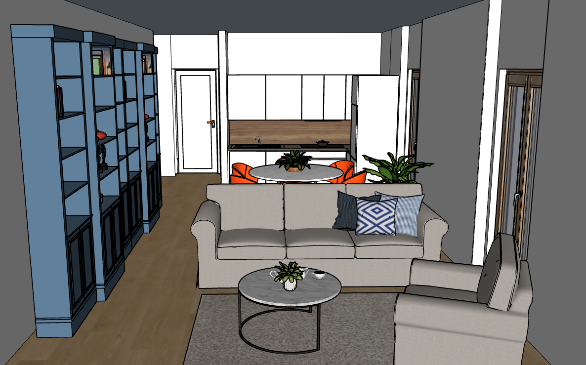 prompt create a beautifully rendered modern living space with a cozy inviting atmosphere use a soft beige color for the sofa and armchair accented with pillows in navy blue and patterned white and blue the bookshelf should be a rich royal blue with elegant detailing filled with books and decorative items in earthy tones for the floor use a warm oak wood texture adding a plush gray rug beneath the coffee table the coffee table should be round with a polished marble top adorned with small green potted plants use bold orange for the dining chairs set against a minimalist white kitchen background add lush green plants for a touch of nature ensure the space is well lit with natural light streaming from large windows creating a warm and harmonious feel throughout