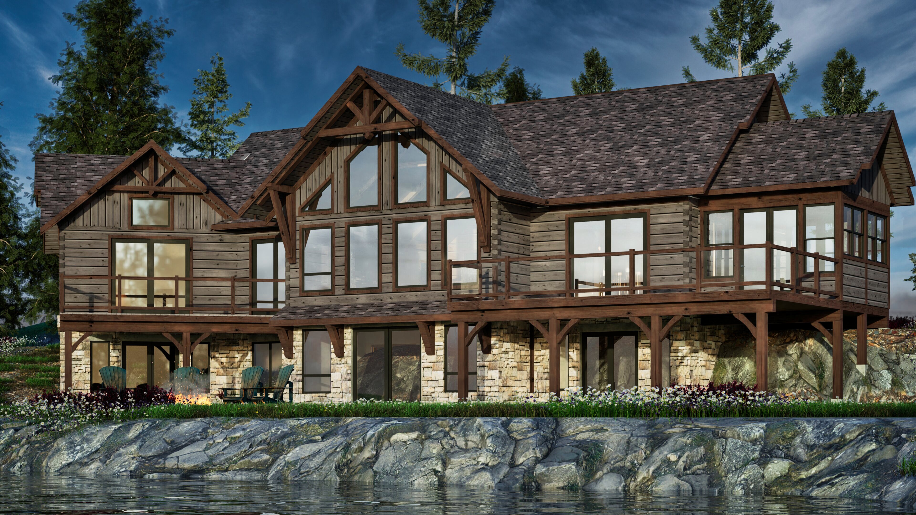 make this render look realsitic add some trees found in ontario in the background place this building on a farmland not a lake front this is also a flat land so no stones