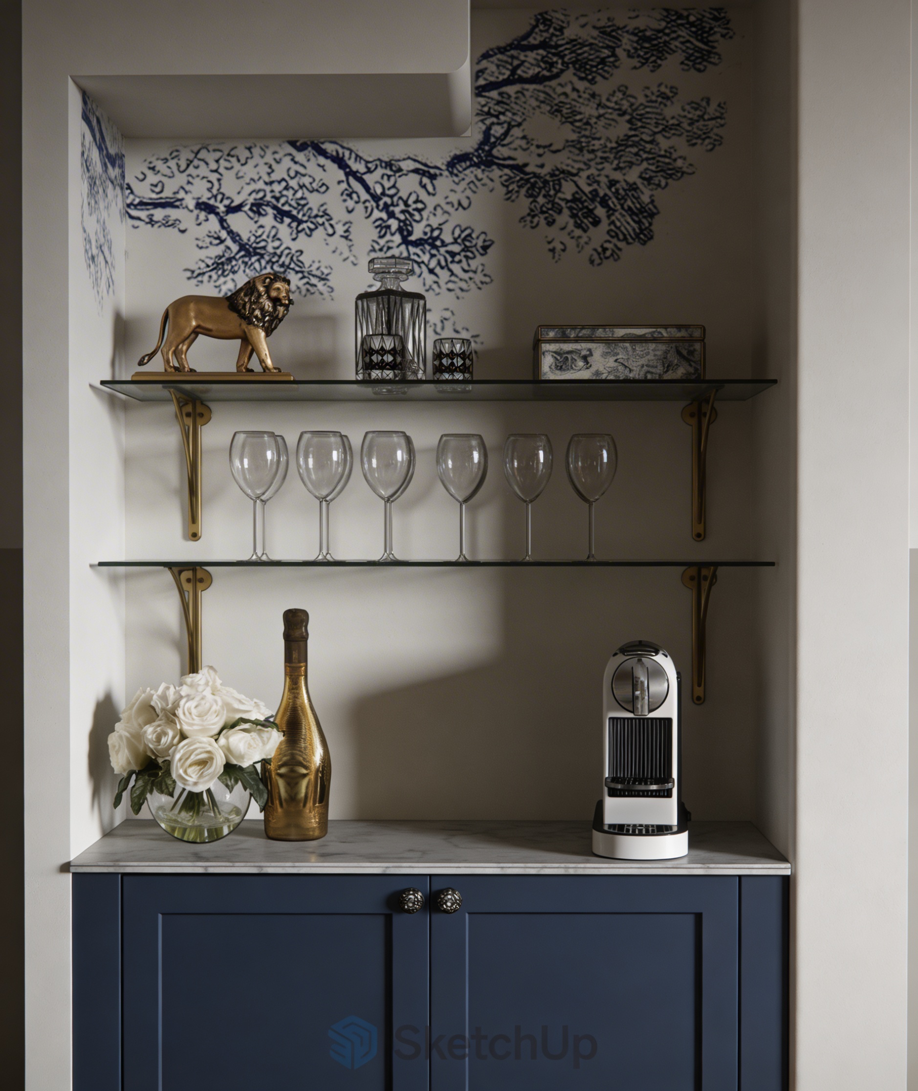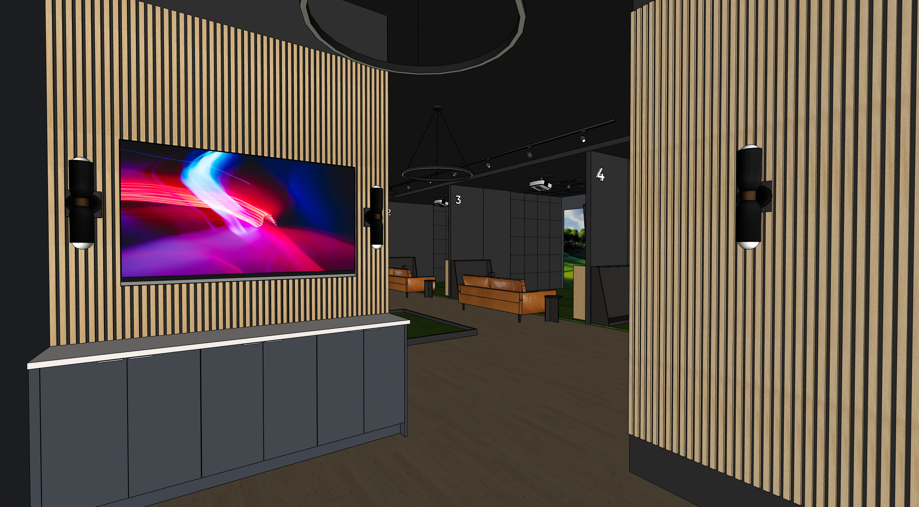 this image is an interior of an indoor golf lounge the numbers on the wall are back lit cabinets are dark navy blue with stainless steel cabinet edgepulls the round chandelier are modern led light chandelier
