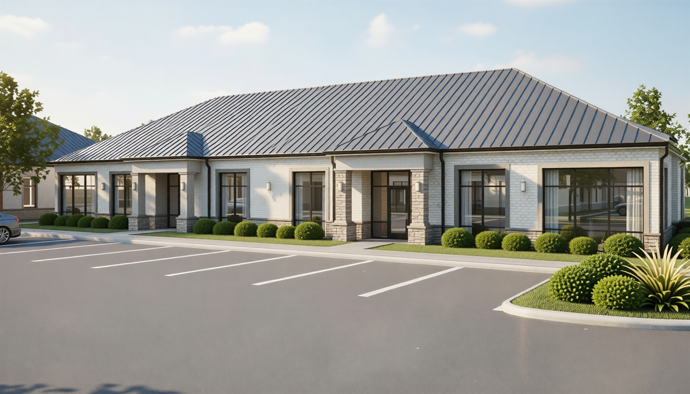 daytime view with brown red brick white stucco and dark gray trim black windows
