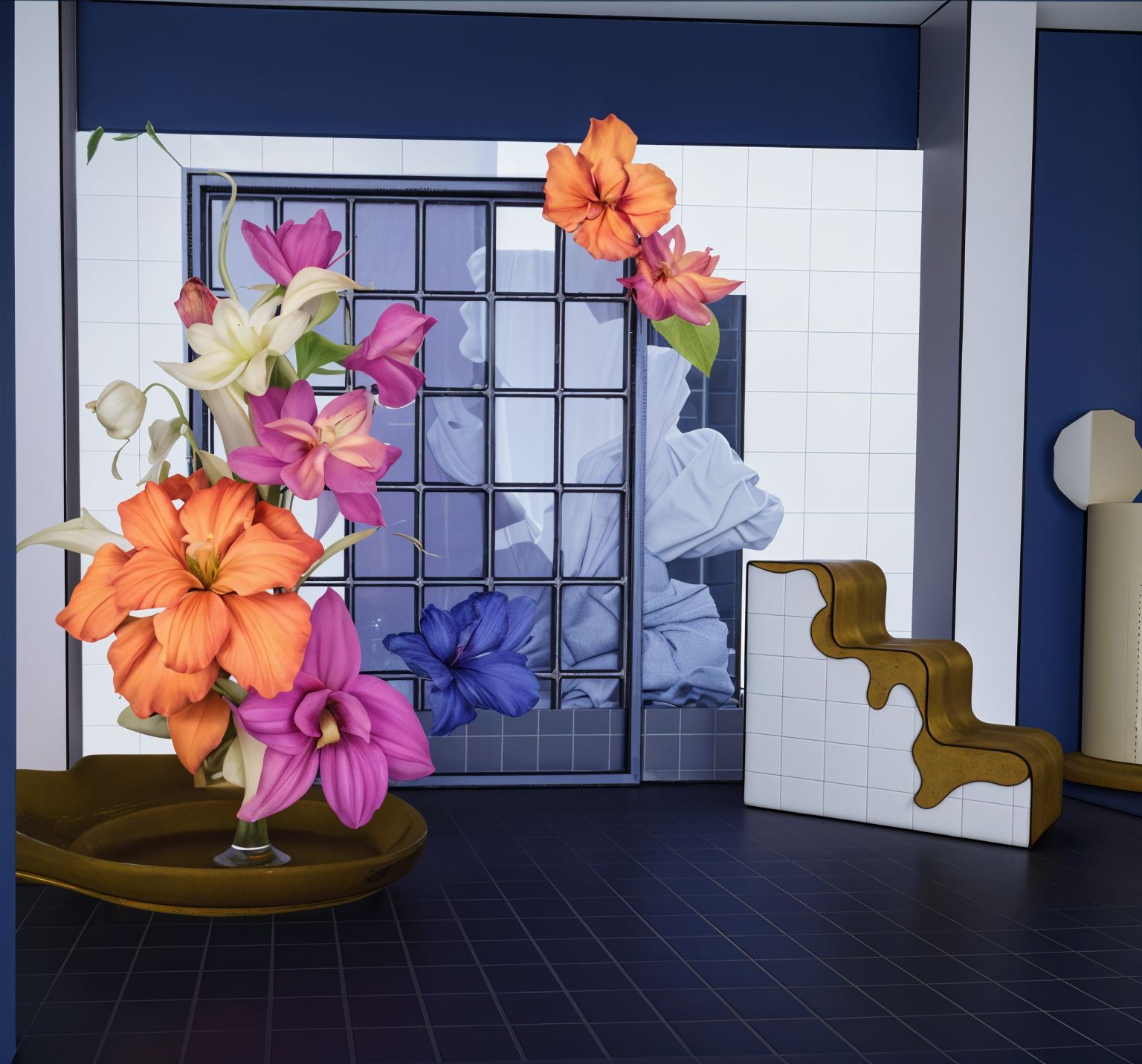 interior rendering of a kicthen and living space modern with some artwork in the walls architecture