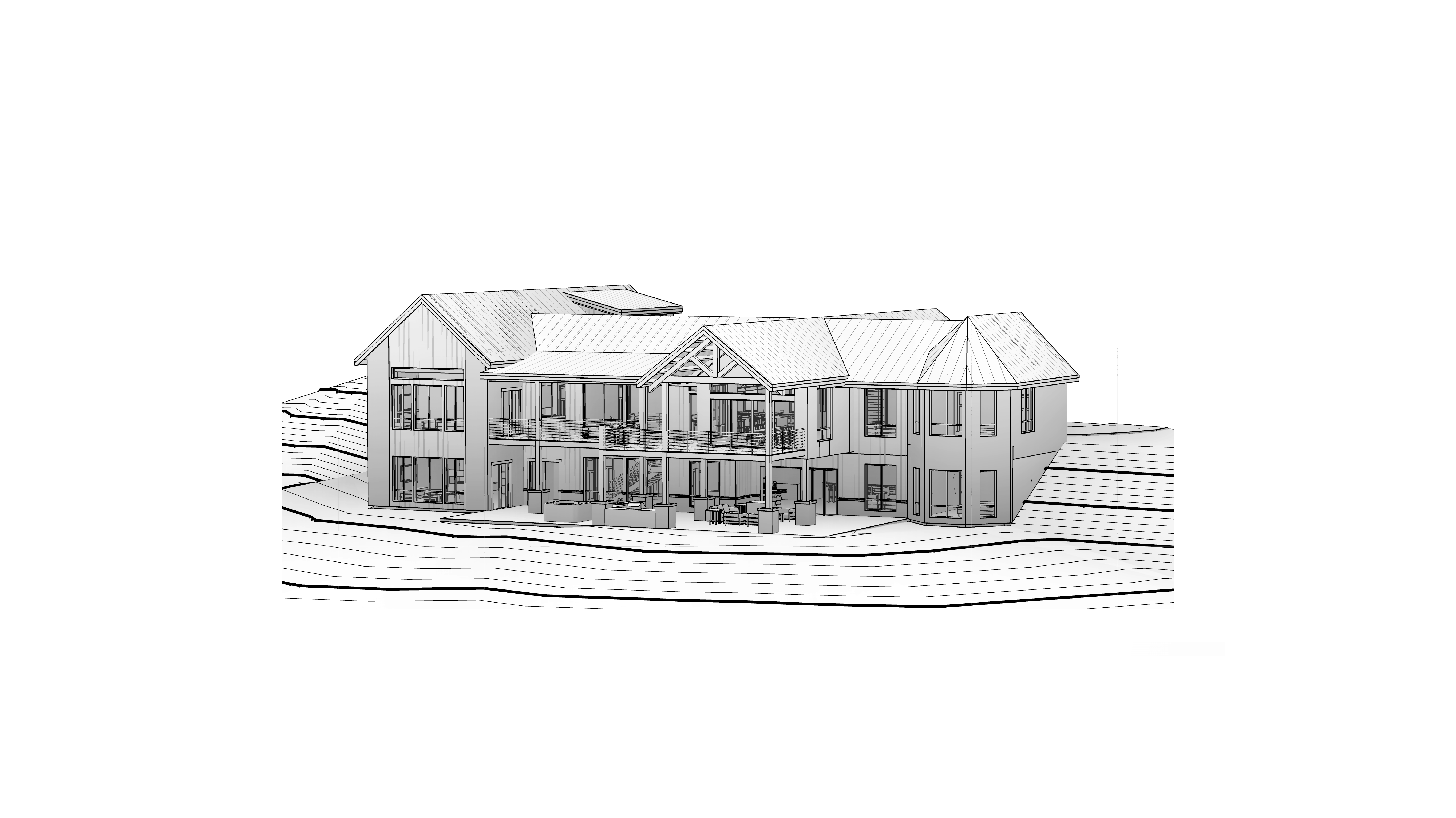 rear view of a clean rustic architectural exterior rendered in cinematic vibrant golden hour lighting with blue skies mountain modern with heavy timber architectural style light stone siding beautifully lush green manicured landscape around structure with hedges and gardens black standing seam metal roof cinematic lake in the reflections of the windows douglas fir trees surrounding the house in the background high fidelity photorealistic visualization crisp shadow falloff refined facade geometry soft atmospheric depth premium architectural photography mood ultra clean composition and materials dark trim around windows