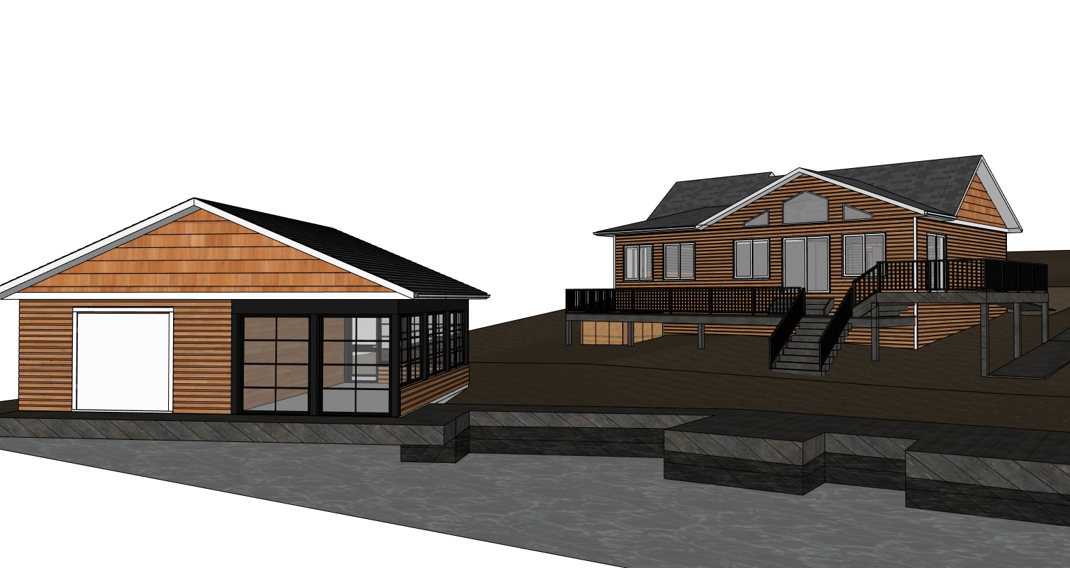 cabin is lakefront on the canadian shield surrounded by pines spruces poplars and birch trees sun is setting in the background behind the trees