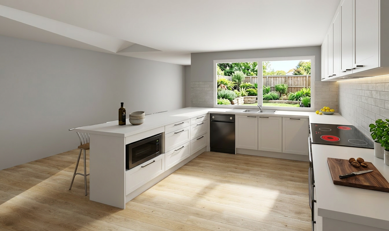a modern urban building art deco style facade with vertical lines use soft beige for the exterior walls and warm light gray for the shutters highlight window frames with charcoal black accents set in a bright sunny day with a clear blue sky and soft shadowing for a crisp and inviting atmosphere
