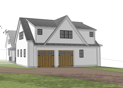 make siding dark gray vertical board and batten add flower rock gardens in front of three windows on left and beneath single window next to garage doors make back ground gentle sloping hills many miles away in early sunset