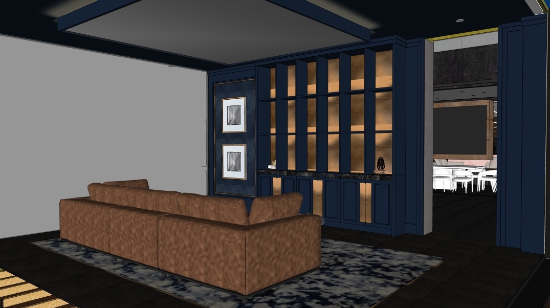 dusk sarasota fl soft accent lighting in shelves camel leather sofa black and white photos in frames accolades on shelving mirror on underside of drop ceiling structure maintain blue color on walls and cabinets with gold accents moody library vibe recessed lights in ceiling to provide ample light in space entire left side wall is large seamless glass window