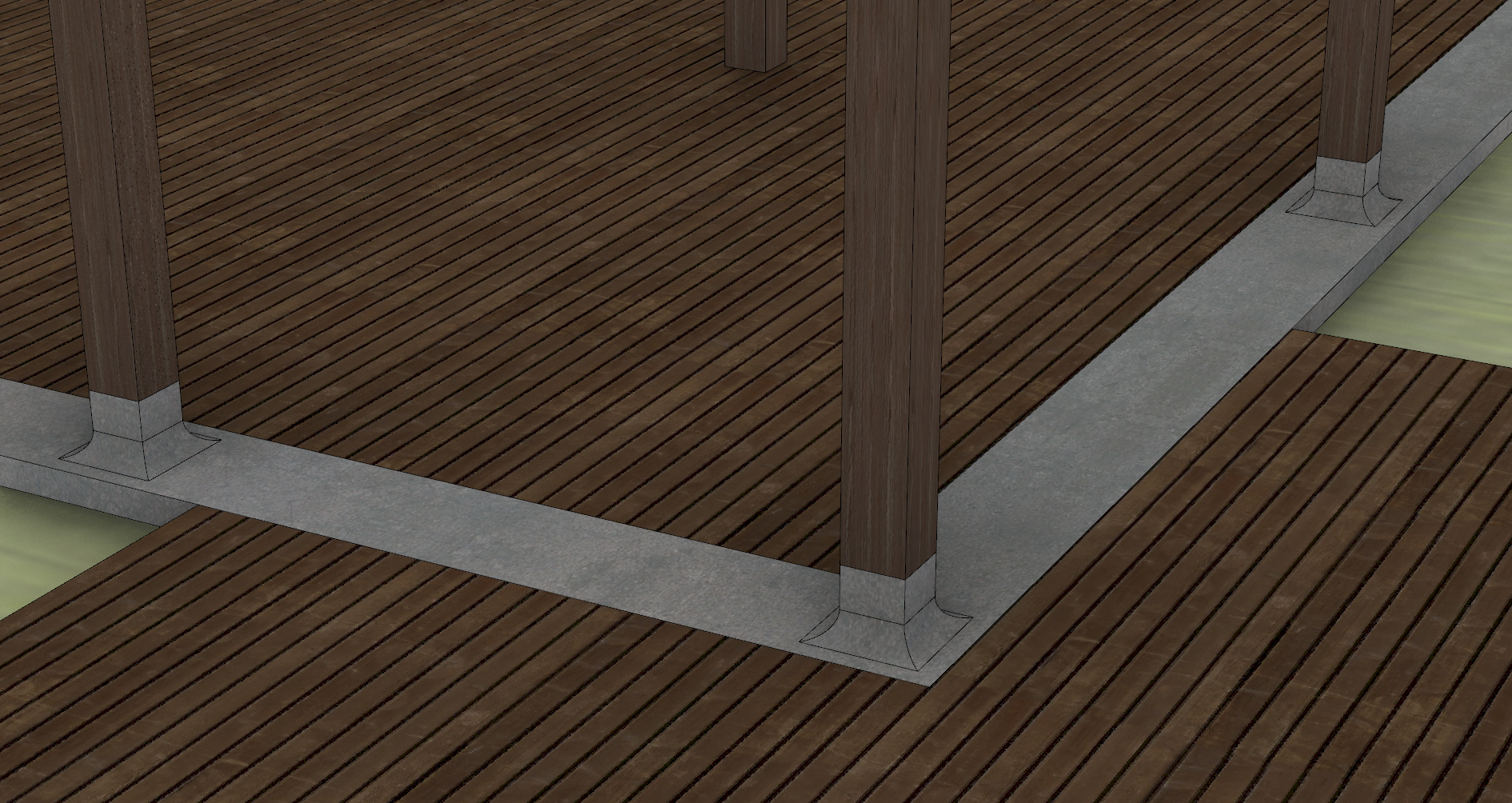 hd render of a flooring threshold detail of a pavilion oudoor foreground is wooden decking the grey colour is polished concrete with curved pedestals supporting wooden columns made of eclaimed timber dark colour the flooring in the background is wooden planked flooring remove all black lines decking to be perfectly consistant