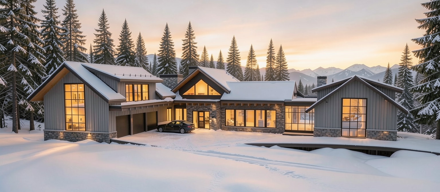 tadao ando exterior shot can you render the attached image the materials are to be rammed earth green vegetated roof in a dry climate over the main curved roof the roofing is to be galvalume metal seam roofing with cedar siding can you add dynamic columns supporting the overhang architecture