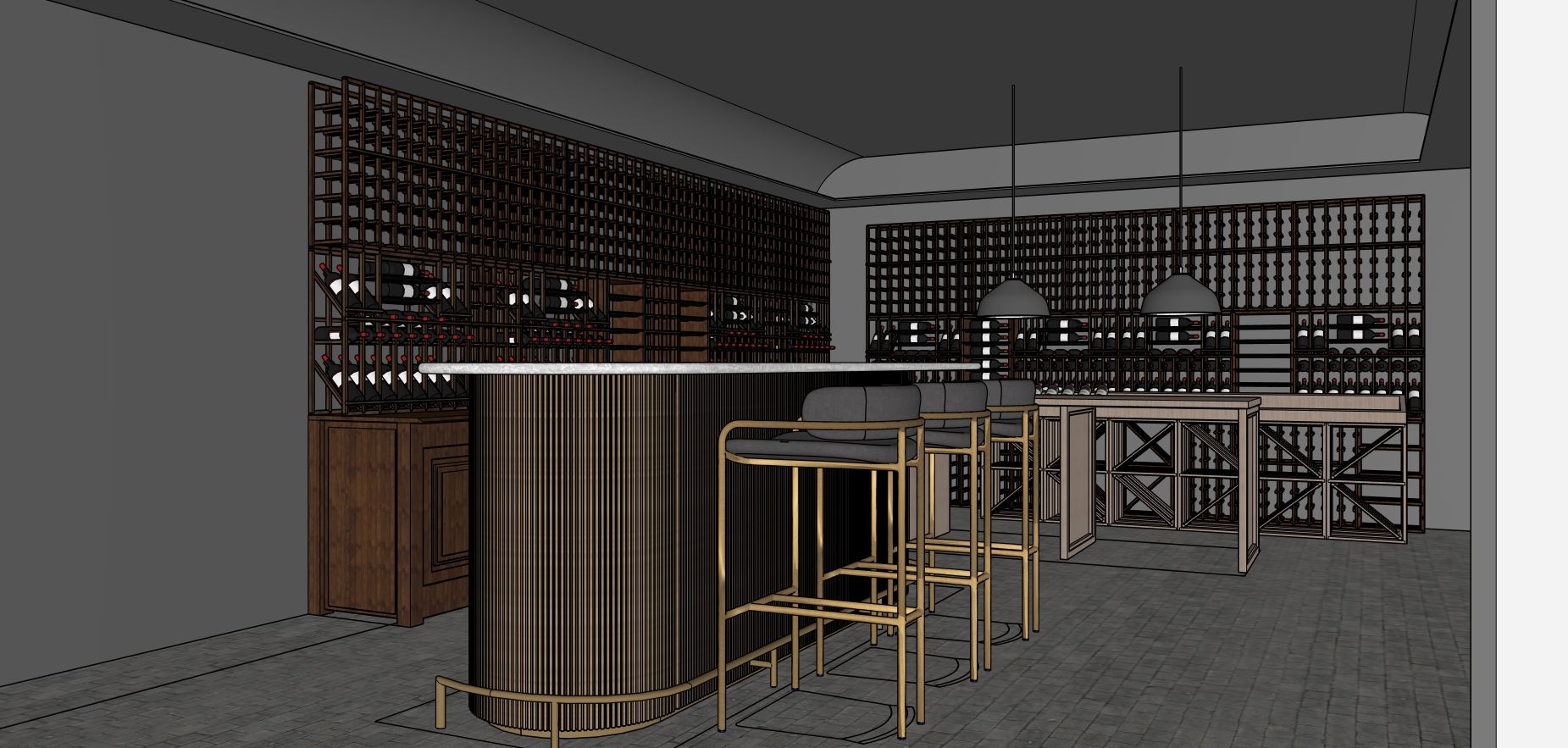 interior shot a luxurious wine bar interior with an elegant sophisticated atmosphere the wine shelves are crafted from rich dark mahogany wood filled with a selection of finely detailed wine bottles the bar counter features smooth dark walnut wood with a polished marble top in a soft white hue the high stools are designed with plush charcoal colored cushioning and sleek brass frames the ceiling is painted in a warm gray color with ambient pendant lighting casting a soft cozy glow the overall atmosphere is warm and inviting with a focus on modern elegance and attention to detail the image is also quite luminous architecture