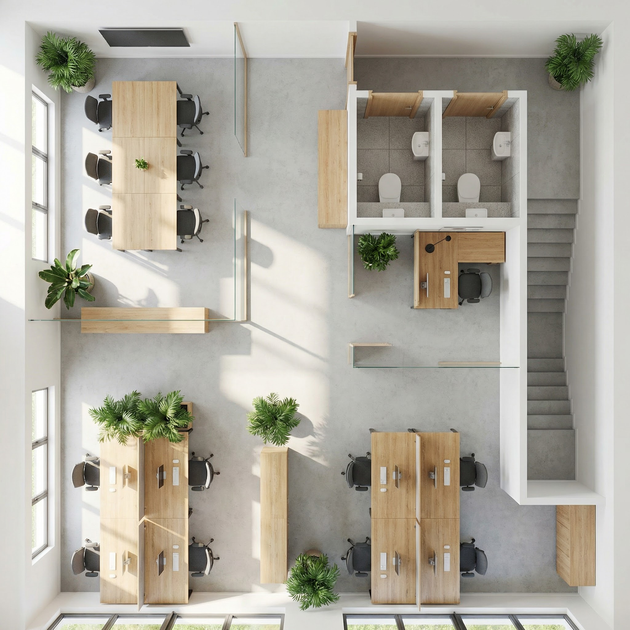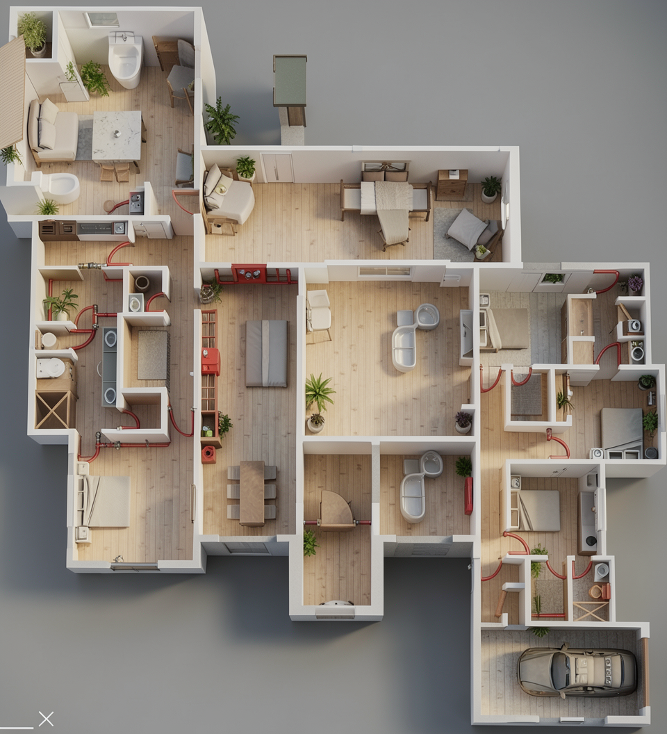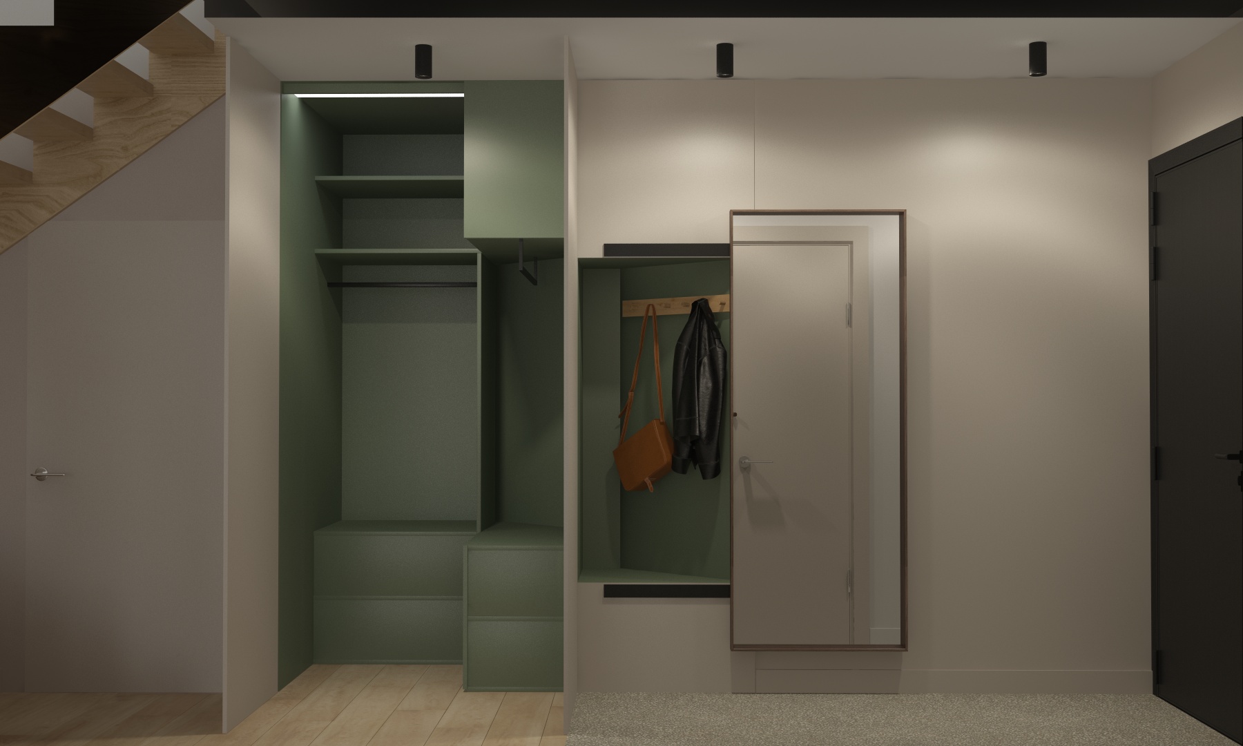 do not change the geometry or the 3d model in any way preserve the exact layout proportions and dimensions the goal is only to enhance the scene into a photorealistic visualization improve overall realism through enhanced lighting materials and shading while keeping the original design fully intact the scene is illuminated by three spotlights providing balanced realistic lighting the white balance is neutral with correct exposure and natural physically accurate shadows on the left there is a frameless door painted in the same color as the walls emphasize a realistic paint finish subtle surface texture and natural light interaction without altering its shape or structure on the right there is a built in wardrobe niche in the green wardrobe module add coats hanging on a rail arranged naturally and realistically enhance material realism depth and shadow behavior inside the niche without changing its geometry or layout