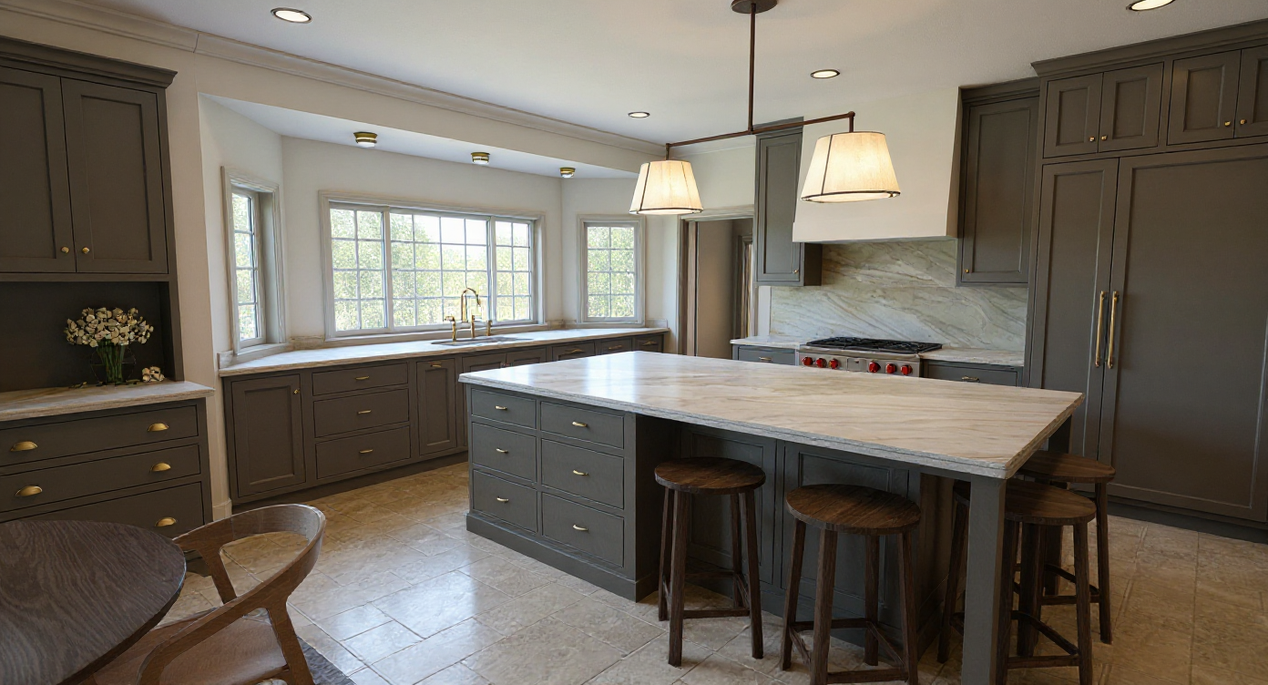 render this in a photorealistic way keeping exact details and colors can you make the island a dark stained white oak