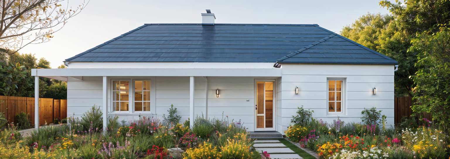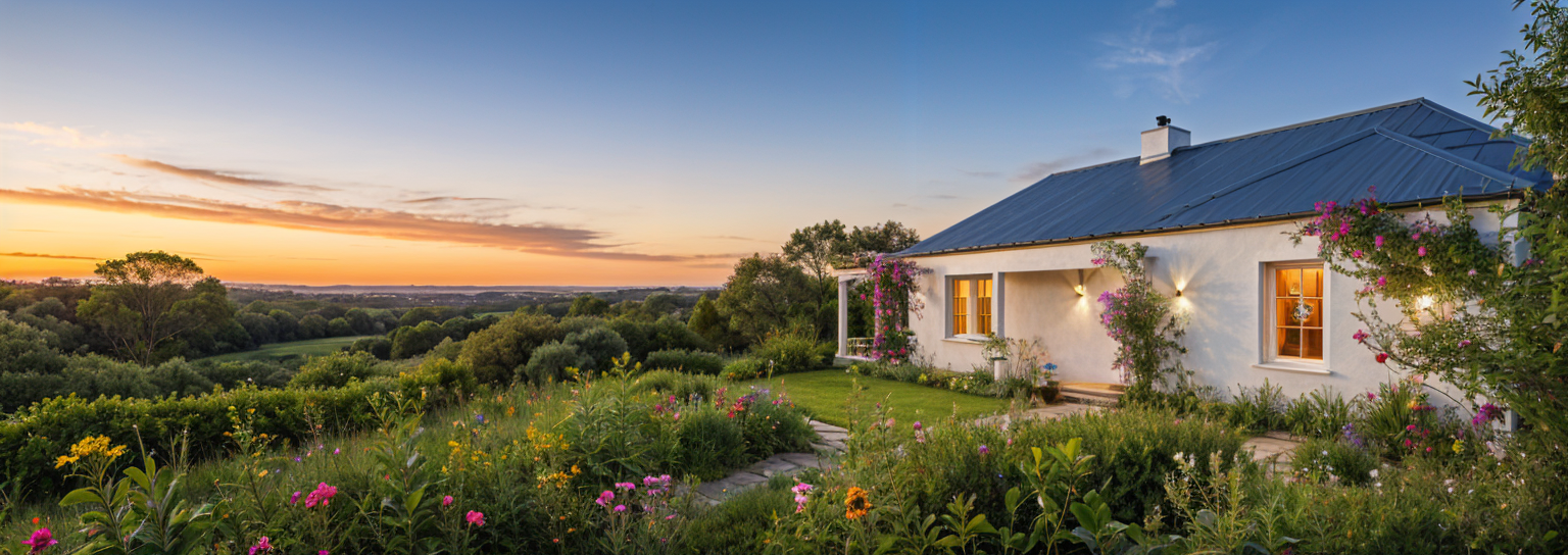 classical exterior shot in an australian rural setting at sunset with a lush green garden external colour pallette of white and soft grey architecture