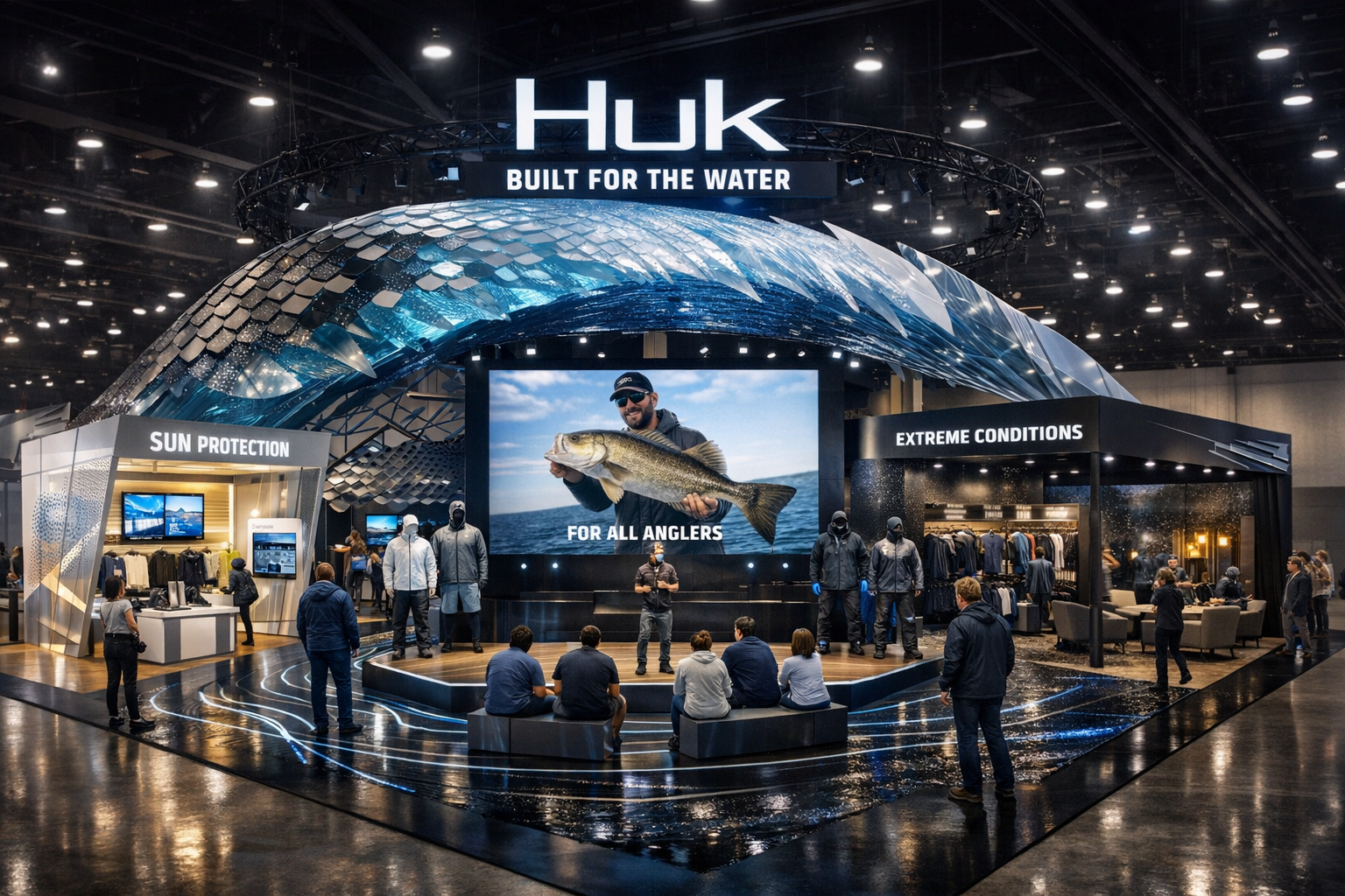 yes i d design it as a 40 x 50 island booth called current ribs a cleaner more engineered marine performance environment where the architecture itself is the proof of hatch x s manufacturing that fits huk well right now because their brand story is explicitly about for all anglers everything performs and bring the energy and their current product storytelling leans hard into sun slick decks foul weather and performance across salt fly and freshwater it also matches what hatch x can credibly show in the booth itself publicly hatch x highlights cnc routing cnc fiber lasers laser welding paint polyurea coating large scale 3d printing interactive touchscreens led walls and a 7 axis robot arm so the smartest move is to make those processes visible in the structure not hide them backstage concept think of it as a boat hull exploded into a field of precision ribs instead of a heavy scenic wave the booth uses 7 9 sweeping structural ribs over the center lane clean aerodynamic premium and unmistakably fabricated the ribs feel like a cross between current lines cast arcs and hull frames the booth should feel technical not rustic premium not themed performance on water not fake dock set 40 x 50 plan assuming the 50 side is the primary hero face 50 primary aisle 12 sun heat lab 26 cast deck theater 12 grip find your water led storm lab 14 buyer lounge 22 product wall stock 14 dealer consult 40 depth recommended heights 18 20 to top of brand sign 14 clear under the rib canopy 10 12 for the two side zone volumes 16 wide led wall on the center stage what the structure should be 1 overhead current ribs this is the hero element use laser welded steel armatures large scale 3d printed shrouds node covers laser cut aluminum fin infills subtle translucent blue edge lighting only on the undersides the important part is restraint keep the canopy open and skeletal not a full enclosed shell that gives you better sightlines keeps huk branding readable and makes the booth feel more expensive 2 cnc routed flow deck floor the floor becomes the second hero feature use cnc routed panels to create current line grooves topographic flow patterns integrated led inlays gloss satin contrast finishes then use polyurea coated zones where you want a tougher wet deck feel especially around the grip demo hatch x publicly positions polyurea and protective coatings as part of the shop stack so this is a clean way to make the floor itself feel engineered 3 laser cut scrims and scale surfaces at the two side zones add fiber laser cut aluminum scrims that abstract fish scales gill patterns water turbulence net geometry these can act as light filters merchandising backers semi transparent dividers for lounge privacy 4 exposed process details instead of a separate about hatch x wall let a few structural moments quietly telegraph the process visible printed layer texture on node covers ultra clean welded seams laser etched part ids one or two small plaques reading 3d printed laser cut welded cnc routed that keeps huk front and center while still making the build feel unmistakably hatch x huk experiential elements front and center center cast deck theater this is the heart of the booth an open platform with a large led wall and low perimeter plinths i d make this a find your water experience visitor taps salt fresh fly led wall changes environment and product story floor lighting shifts tone nearby mannequins and product pods update to the selected kit that aligns well with huk s for all anglers language and their current messaging that the gear has to perform whether you fish salt fly or freshwater left side sun heat lab this zone should be bright silver white and airy use it to tell huk s hot weather story with airflow visualization thermal imaging or heat map graphics lightweight apparel try on touch content on venting quick dry moisture movement and upf product wise i d anchor this on huk s current sun performance story the brand is pushing sun protection and spring 26 specifically highlights a1a pro for tropical heat and upf 40 plus watershed for year round wear with dricomfort and upf 50 their performance top messaging also emphasizes breathability moisture management and strategic ventilation right side grip storm lab this zone should be darker and more dramatic make the hero activation a dry traction demo ramp slightly canted deck plane 2 3 marine textures projected water reflections instead of real water surrounding rainwear boot merchandising that ties directly to huk s current rogue wave and foul weather story huk describes rogue wave as durable comfortable slip resistant and waterproof with the grip x outsole positioned for slick decks and uneven docks their pro series rainwear is framed around performance in harsh weather conditions rear band retail buyer lounge the back 12 depth should do the sell in work without stealing the front of house energy i d split it into buyer lounge on one rear corner dealer consult worktable on the other central merch wall hidden storage i would merchandise by condition not by generic apparel type sun storm deck grip off water that better matches huk s performance first storytelling than a normal retail fixture wall materials and palette keep it tight graphite black base architecture matte white ribs brushed aluminum accents controlled electric blue only in lighting and undersides light teak ash tone only in small amounts at stage and lounge that gives huk the water cue without turning the booth into a theme park what i would avoid do not make this a faux marina wood dock or bait shop environment huk s current positioning is too performance driven for that and hatch x s fabrication strength is too good to hide behind scenic clich s the booth should feel like marine product engineering made emotional why this solves the brief this concept puts huk experiential elements front and center because the most visible parts of the booth are about the conditions their products solve heat and uv traction 