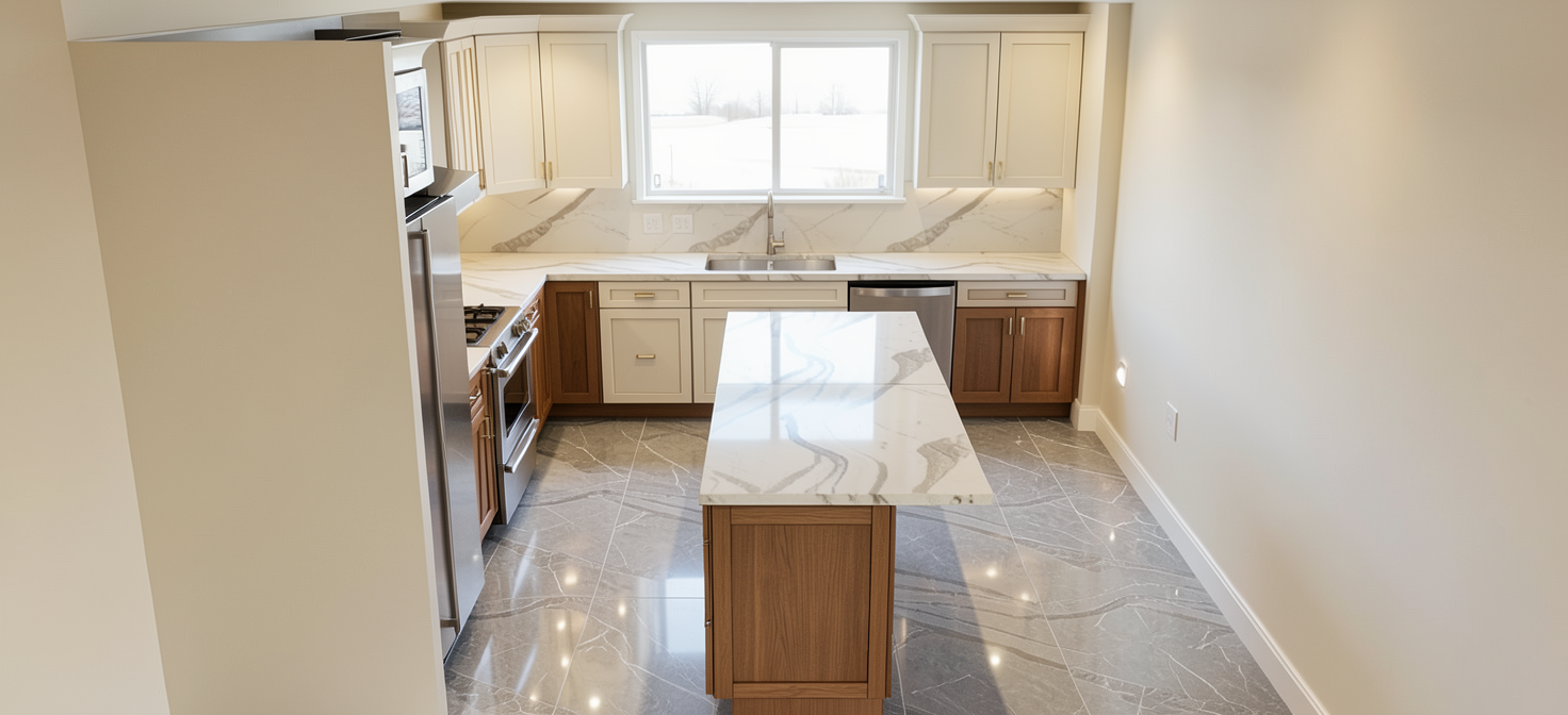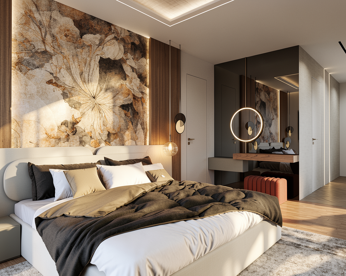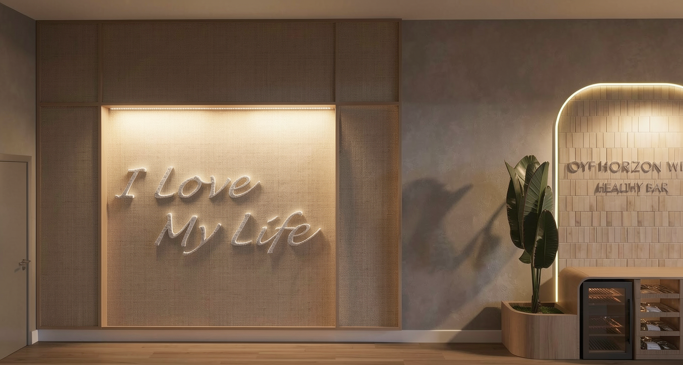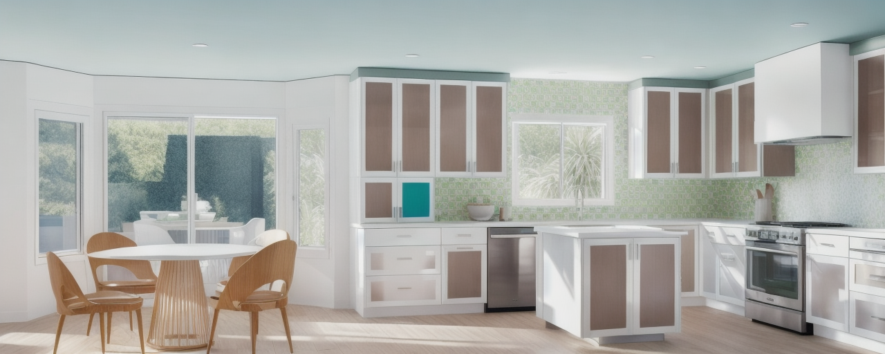 photorealistic interior elevation render of my provided suspended sideboard bar elevation render exactly as drawn follow the exact linework proportions module widths heights reveals and spacing from the elevation do not redesign reinterpret symmetrize or add remove elements any element not shown in the elevation must be omitted the sideboard is a wall mounted suspended unit with curved left and right ends soft continuous radiused corners main cabinet body finished in warm oak wood veneer panels with visible natural grain consistent 3 32 shadow reveals between doors drawers and panels countertop black dekton slab matte or honed finish the countertop appears to float the supporting carcass below is slightly inset from the countertop perimeter creating a shadow line lighting under countertop concealed warm white led strip 3000k under the countertop producing a continuous glow along the front edge below the suspended unit a zone of gorgeous mosaic tile backsplash full width of the sideboard acting as a decorative band below the tile a second concealed warm white led wash illuminating the wall surface upper cabinetry two black metal framed doors with glass inserts matte black finish glass is lightly smoked or clear with subtle reflection behind glass adjustable shelves displaying drinking glasses and barware center section between the two glass cabinets two black floating shelves slim profile shelves display high end liquor bottles and tequila bottles integrated warm led lighting either above or below each shelf for bottle highlighting material color palette warm oak wood matte black metal black dekton subtle smoked glass warm lighting lighting mood soft warm architectural upscale bar ambience no harsh hotspots no visible led diodes camera straight on orthographic elevation centered eye level no perspective distortion high realism crisp edges soft shadows accurate material textures no people minimal surrounding context