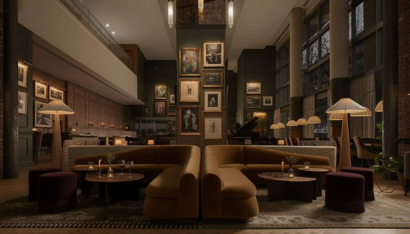 modernist exterior shot make this image a dark and moody cocktail lounge with a warm amber glow architecture