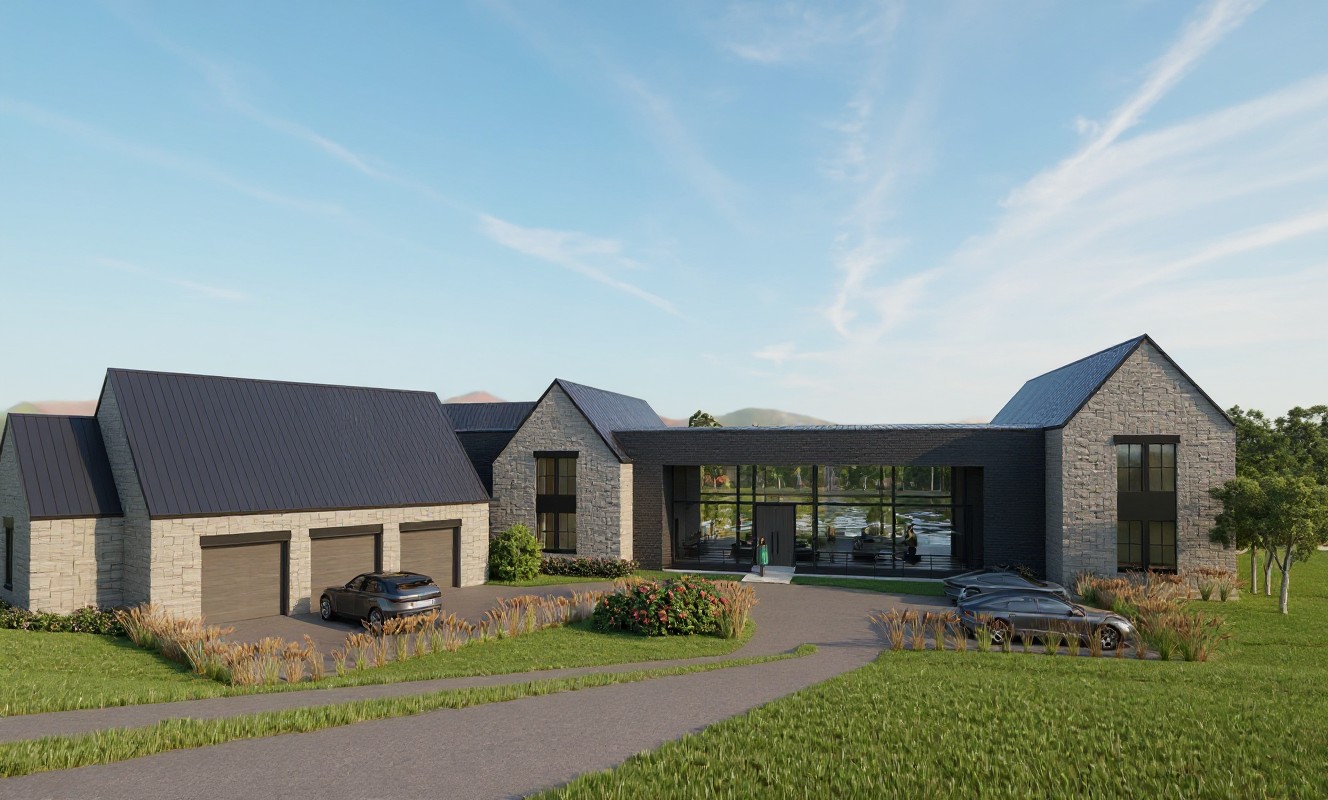 make stone more gray concrete driveway black brick on middle form of house more clouds and color in sky brighter scene on front of house