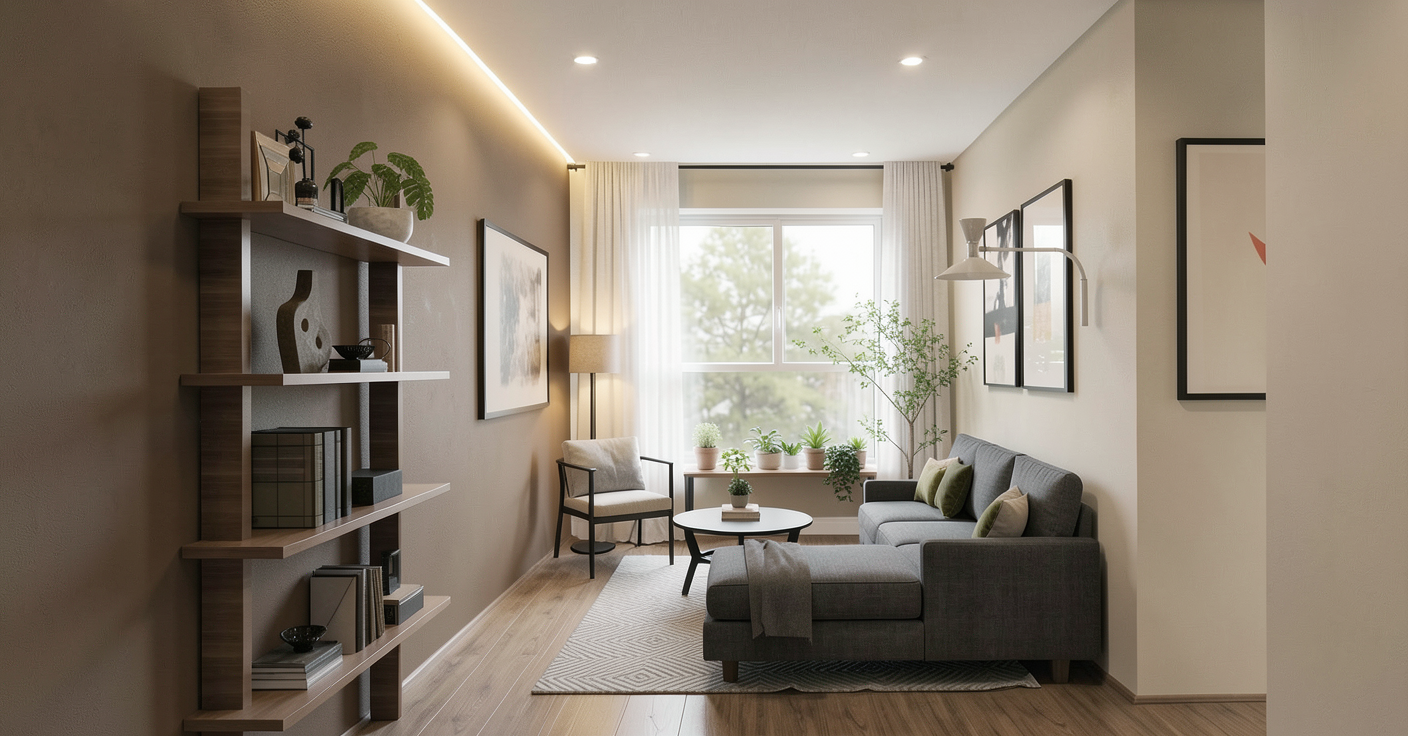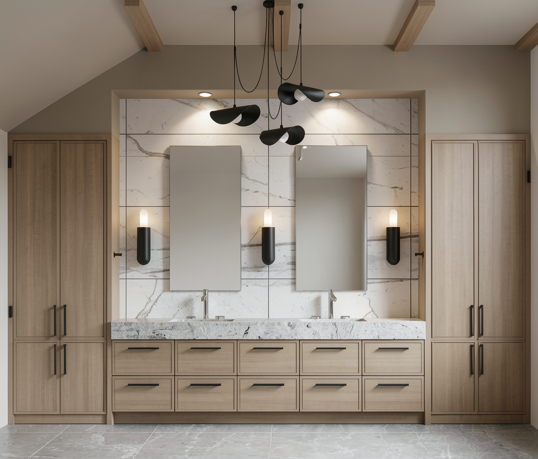 photorealistic 3d interior elevation for archsynth updated final prompt maintain all previously specified features scale and millwork from the original sketch apply only these exact requirements and do not alter the sconce design position or finish from the sketch core composition to keep symmetrical double sink elevation two tall linen cabinets flanking a long wood vanity with twelve flat panel drawers medium oak wood finish matte black slim hardware pulls frameless rectangular mirrors slim chrome single handle faucets sculptural matte black multi arm pendant warm grey large format floor tiles clean modern luxury spa mood high quality gi realistic material roughness reflections and fine millwork detail sconce instruction critical use the exact sconce from the provided sketch do not change its form proportion mounting height finish or placement match size shape orientation and matte black finish as shown in the sketch positioning mounted between each mirror and adjacent tall cabinet at the same height and offset as in the original sketch updated material color architecture tall cabinet sides and reveals warm medium oak wood matching vanity no stone on cabinet sides soffit bridging from tall cabinets over vanity soft warm taupe softer less khaki use original sketch s softer taupe ceiling angled portions and flat areas between beams and both side walls painted the same soft warm taupe as the soffit uniform taupe across soffit walls and ceiling exposed ceiling beams medium oak wood matching vanity cabinets add a fifth beam so there are five equally spaced beams backsplash dolomite tiles 24 x 48 pieces with visible grout joints and natural dolomite veining dolomite color softer muted white with cool neutral undertone not stark white not yellow no skylight remove any skylight illumination millwork dimensions depth vanity top height 34 above finished floor waterfall stone apron waterfall style apron stone continues vertically at front with apron height 10 toe kick recessed under vanity 4 high standard recessed profile shadowed cabinet and vanity depths tall cabinets 16 deep vanity extrudes past the tall cabinets and is 22 deep vanity front projects 6 beyond cabinet face preserve original sketch scale and proportions lighting fixtures recessed soffit lights small 4 aperture recessed downlights evenly spaced in the taupe soffit above the vanity accent lighting warm 2700k from the sketch sconce exact pendant and recessed soffit downlights balanced ambient room light no skylight camera composition rendering camera straight on elevation 16 9 aspect high resolution cinematic photoreal quality lower crop 6 8 to show more floor tile tile pattern and grout visible while keeping centered elevation composition render settings realistic global illumination physically accurate reflections correct material roughness and bump maps wood grain honed stone texture metal finishes subtle ambient occlusion crisp shadows under floating vanity and toe kick retain all fine details visible drawer seams eased countertop edge realistic grout beveled junctions slight material imperfections for realism deliverable photorealistic true to sketch elevation ready for presentation with the sconce exactly as in the sketch