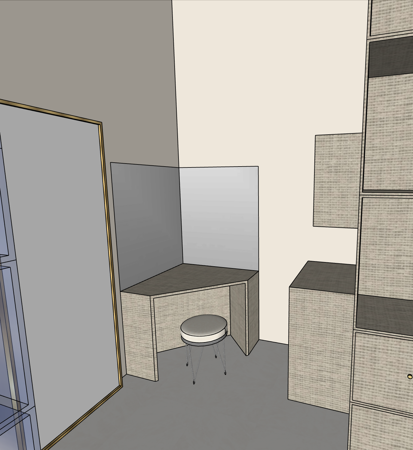 render a luxurious woman s walk in closet featuring sleek modern cabinetry with a light beige linen finish incorporate glass doors with subtle reflections creating a sense of openness use warm ambient lighting to evoke a cozy and inviting atmosphere the floor should be a smooth matte ivory tile add brass handles for a touch of sophistication the overall vibe should be elegant and serene with a focus on luxury and organization