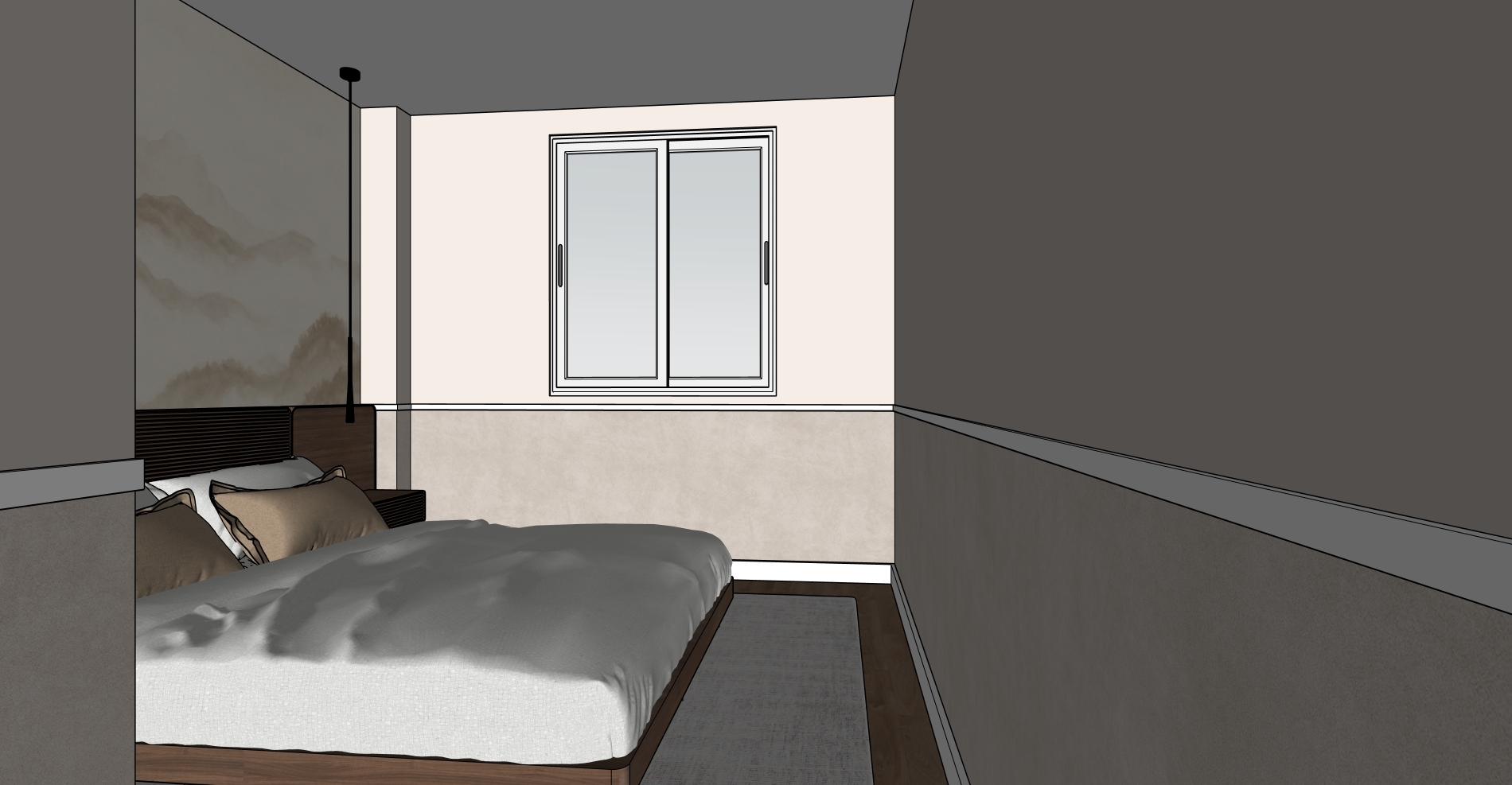 crea una imagen fotorealista a partir de este sketchup mantente fiel al papel pintado original detras del cabecero no lo modifiques