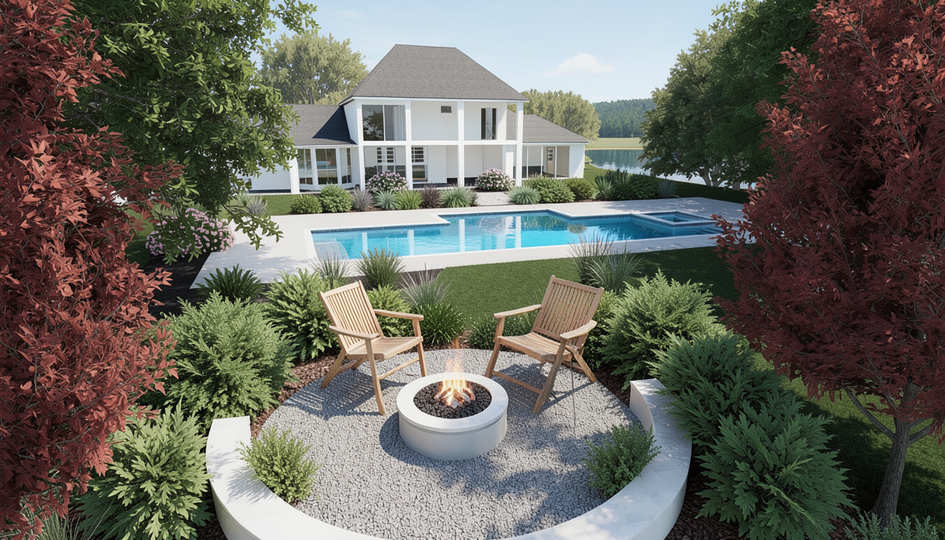 please make the following additions changes add green shrub style plants in all mulch bed areas but not around the firepit area or in it add 4 teak wood chairs surrounding the fire pit please enhance all images for overall photorealism as well